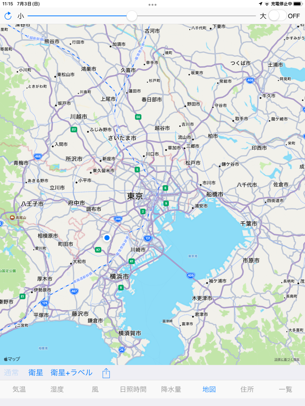 6.[地図]は、通常の地図で、右上に、GPSセンサのスイッチがあります。GPS ONでGPSセンサが有効になり、現在地が画面中央になります。GPS OFFでGPSセンサが無効になり、地図を自由に動かすことができます。