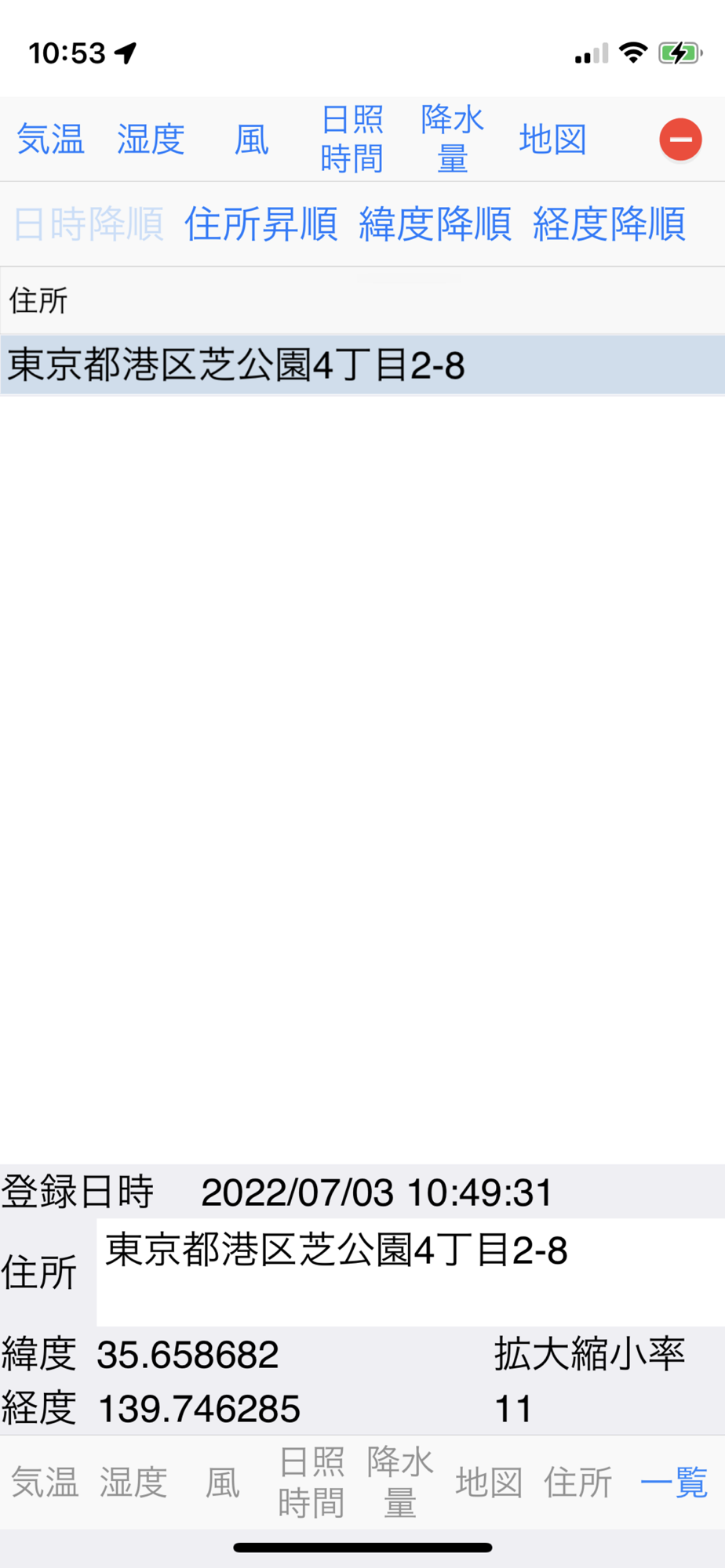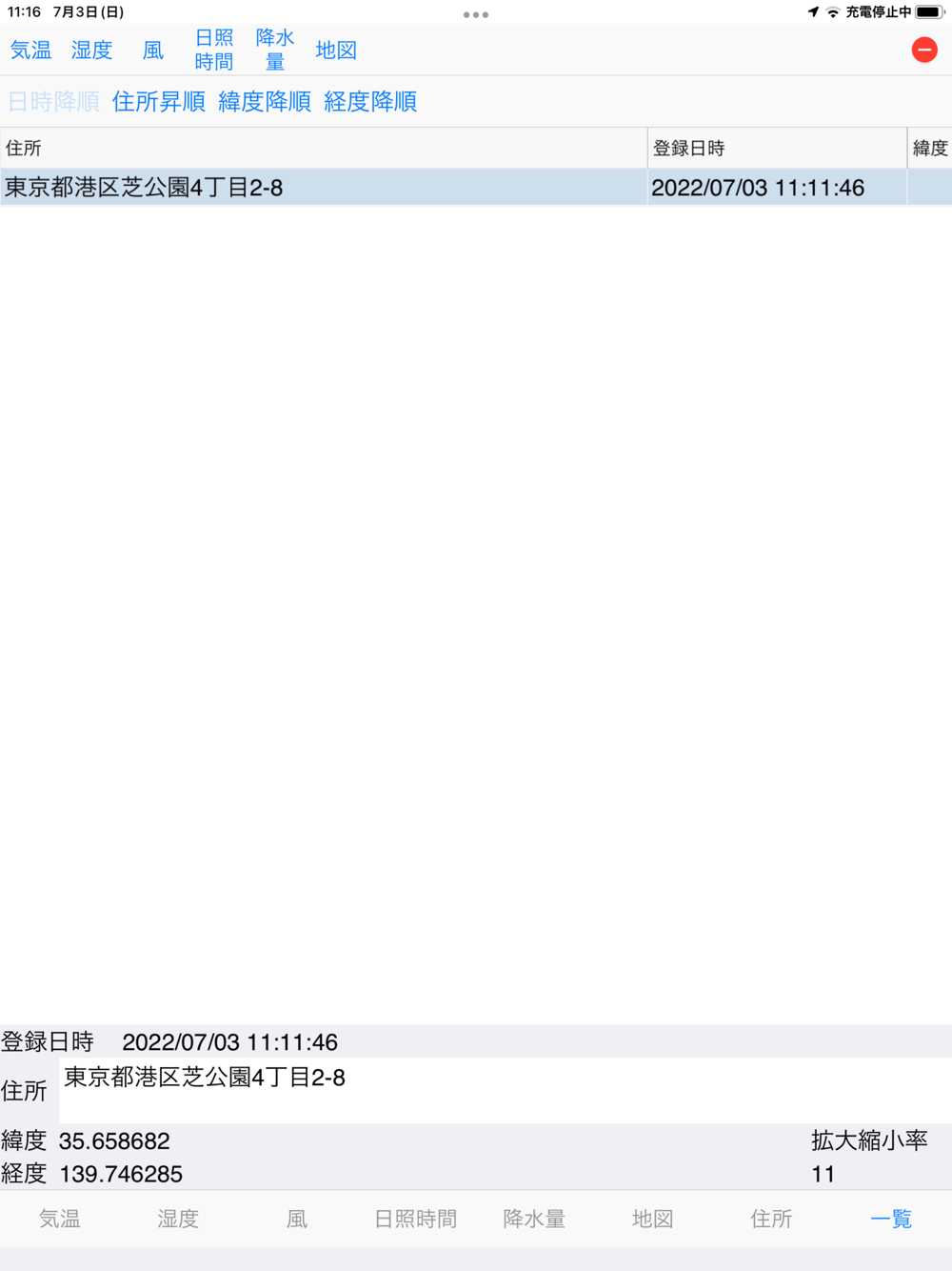 7.[一覧]は、データベースに登録された場所の一覧です。登録時の拡大縮小率で、表示することができます。地図の拡大縮小率の範囲は3~21で、気温、湿度、風、日照時間、降水量の拡大縮小率の範囲は6~11です。地図の拡大縮小率が3~5の場合、気温等の拡大縮小率は6になります。同様に12~21の場合は11になります。