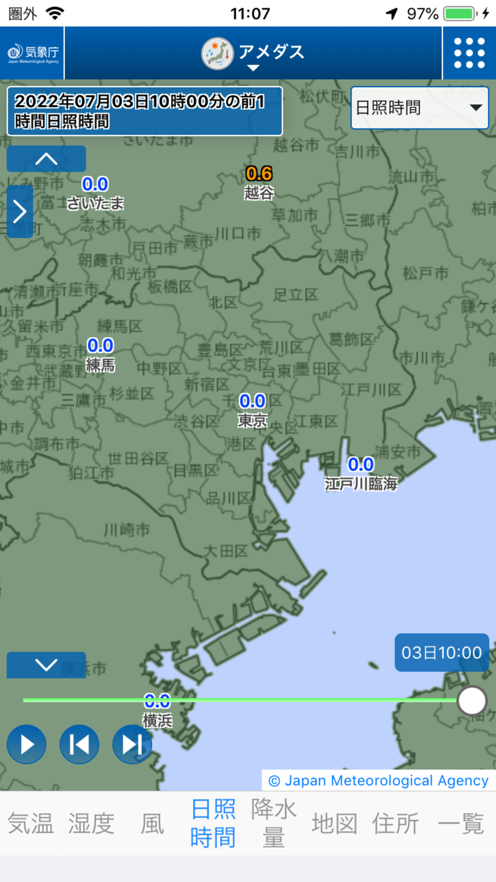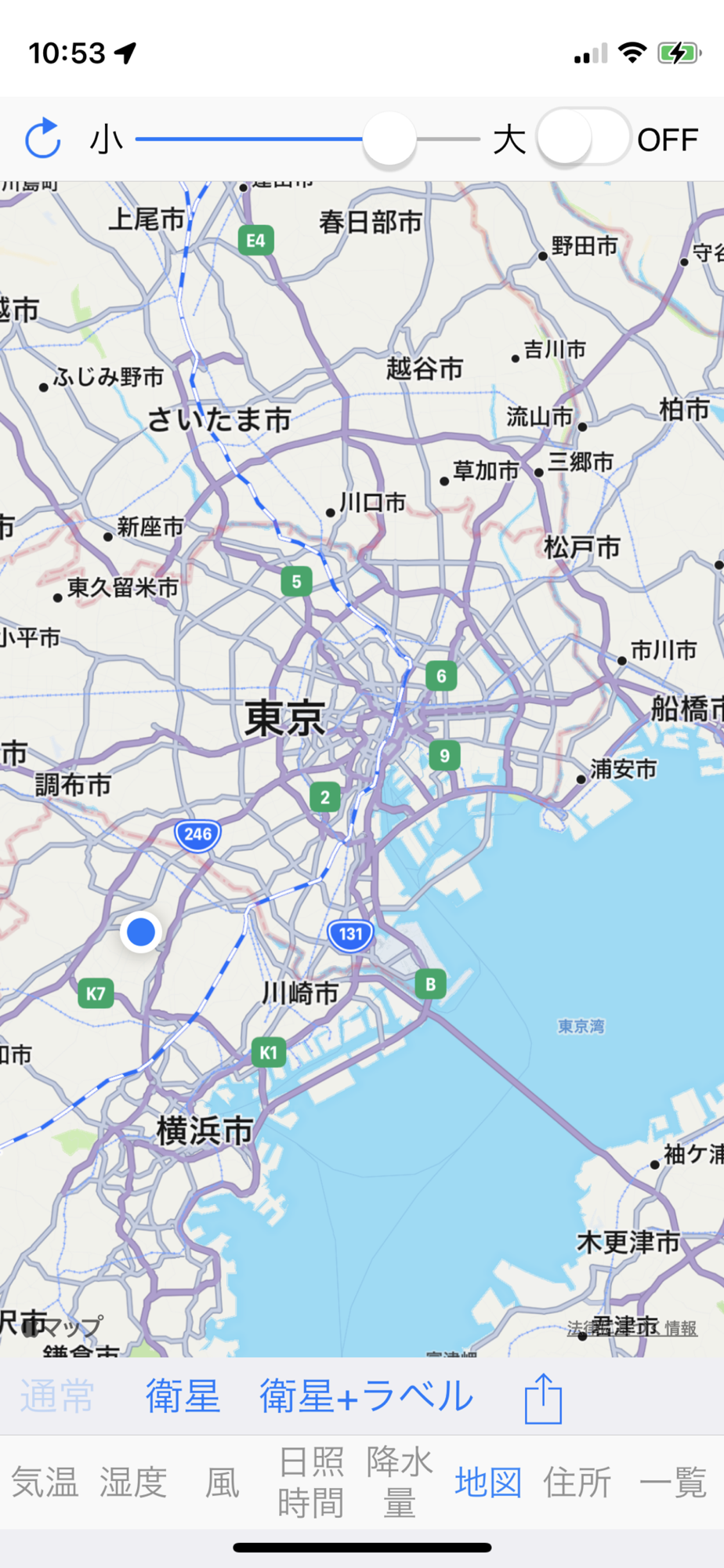 現在地の気温、湿度、風(風向・風速)、日照時間(1時間あたりの太陽が照った割合)、降水量(1時間に降った雨量mm)、地図、住所を表示します。現在地の気象を把握することができるので、外出時等に役立ちます。気象データは、気象庁のアメダスのデータを利用しています。