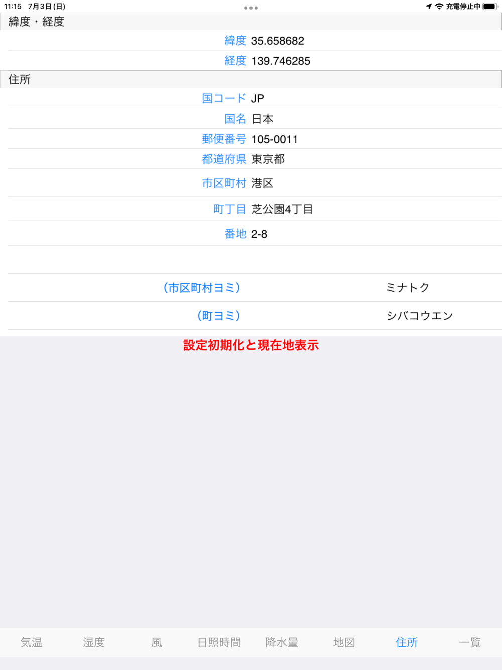 6.[住所]は、現在地の緯度、経度、郵便番号、都道府県、市区町村、町丁目、番地、市区町村のヨミ、町のヨミを表示します。気温、湿度、風、日照時間、降水量、地図の設定を初期化し、現在地を表示させることができます。