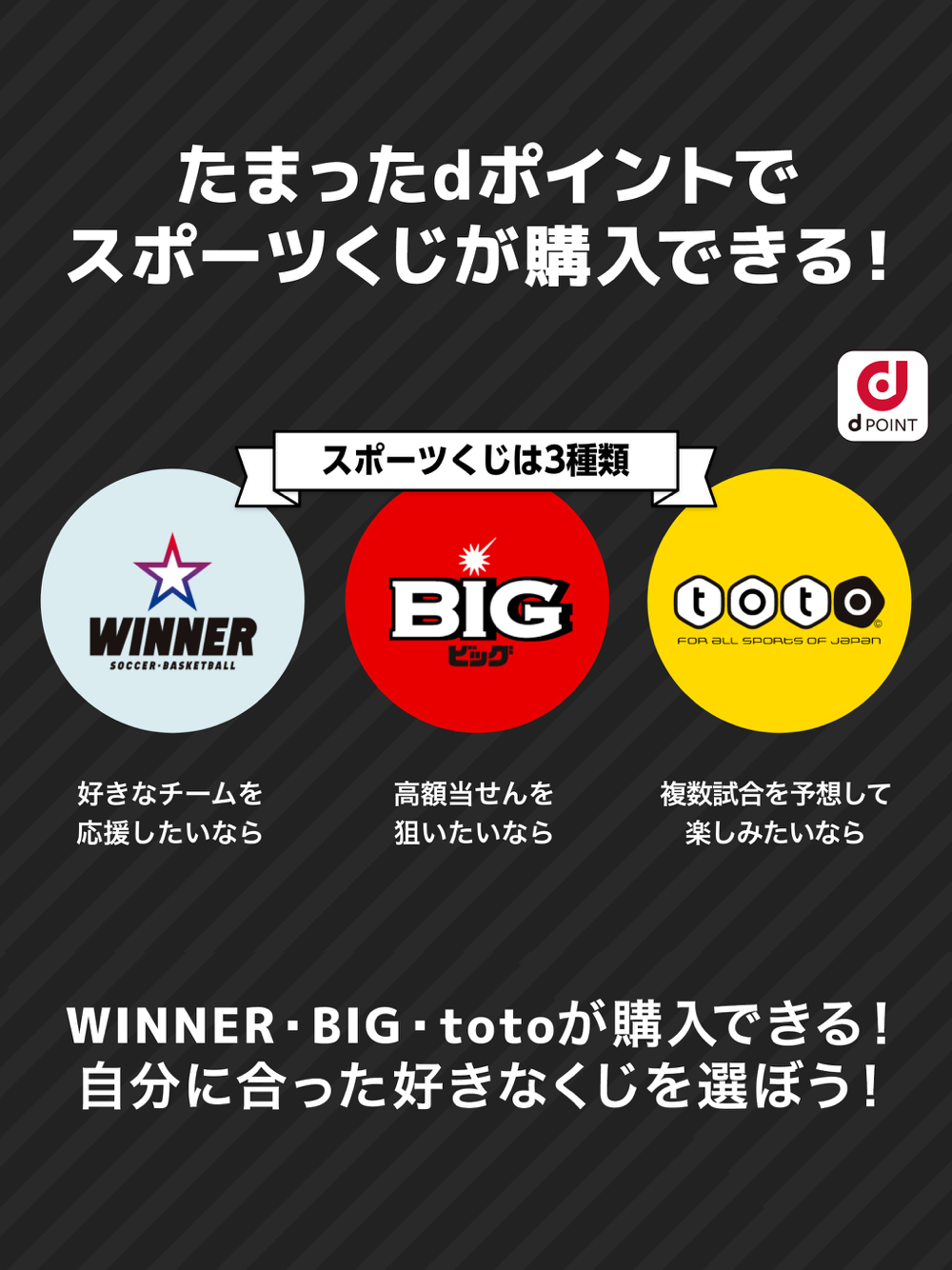 Toto/big/winnerの3種類のくじの購入が可能。
