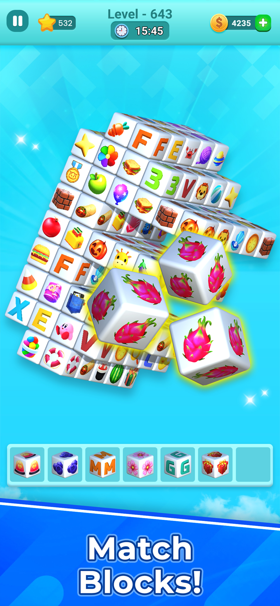 Cube Tile Match 3D is absolutely an addictive strategy games that you must fall in love with once you play it. As a board game, this matching 3d game is simple & entertaining for anybody to enjoy!