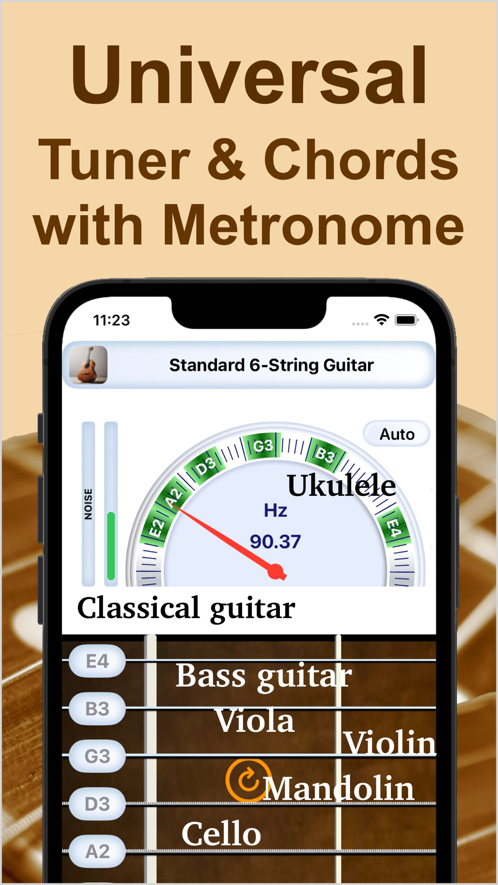There are more than 20 musical instruments which can be easily tuned in the app: 6-strings, 7-strings, 12-strings and bass guitars, mandolin, ukulele, banjo, violin, viola, cello, shamisen, domra, oud, balalaika. If you think that we have missed any musical instrument please let us know! Our development team will be happy to add your instrument.