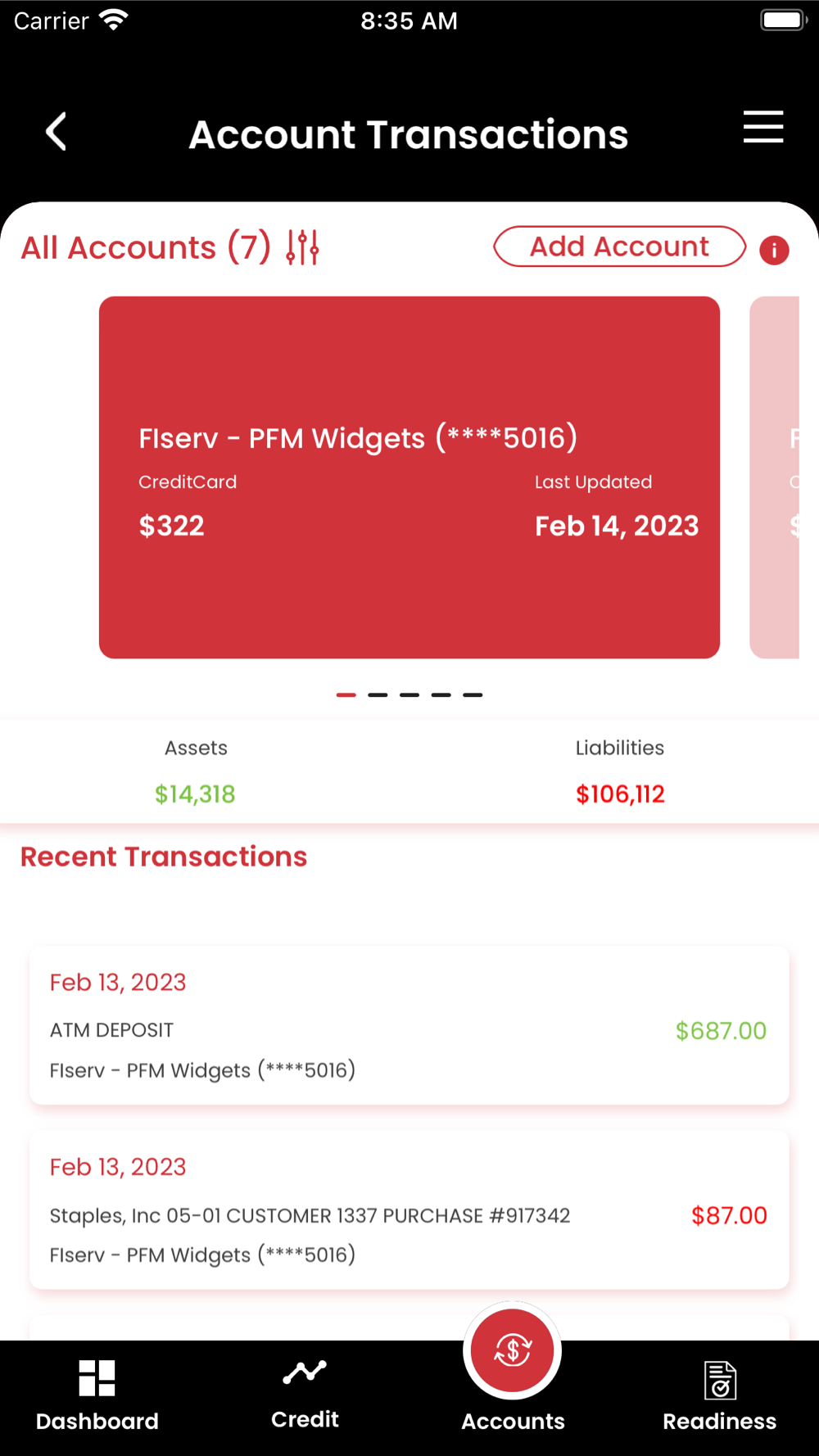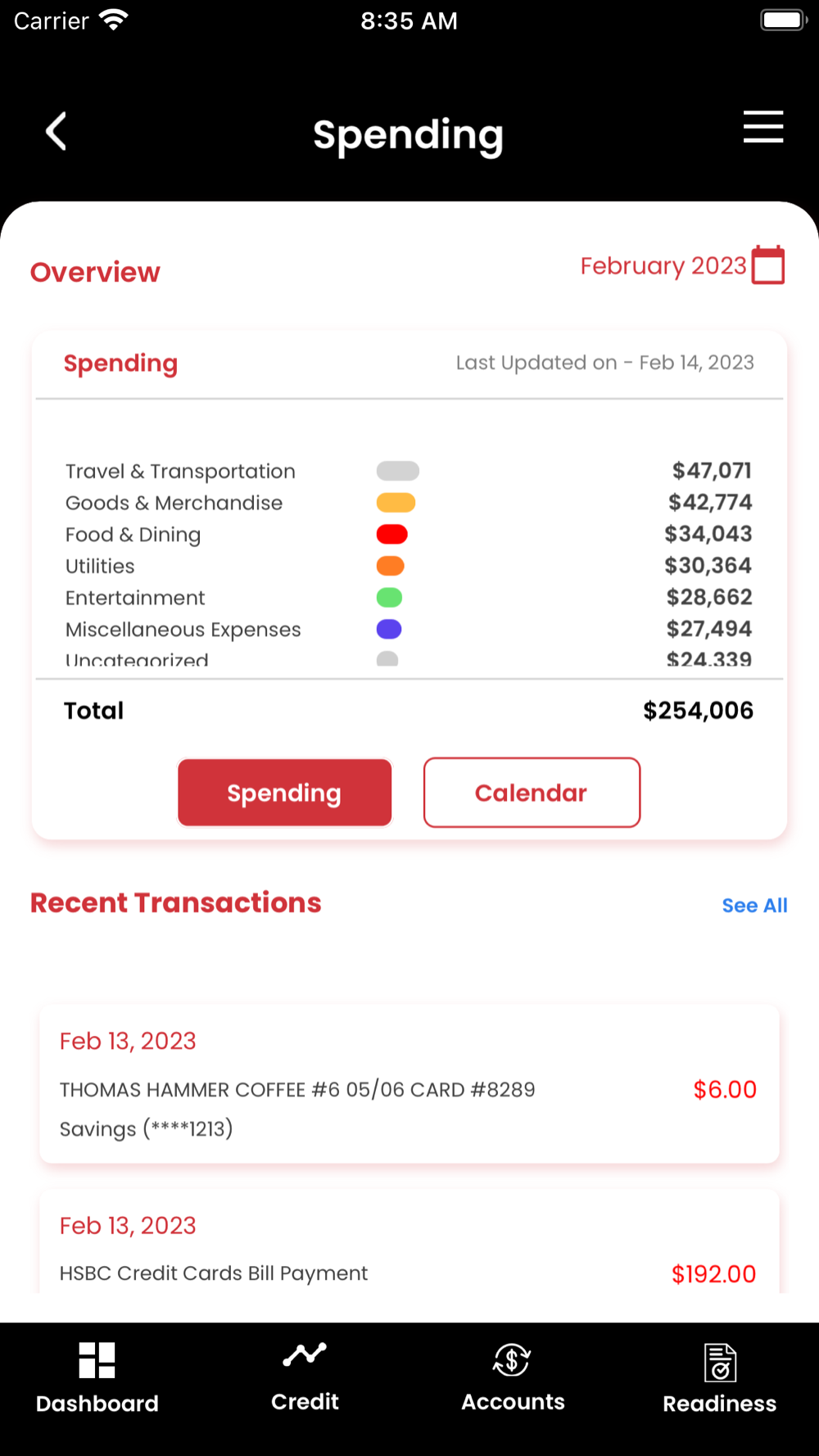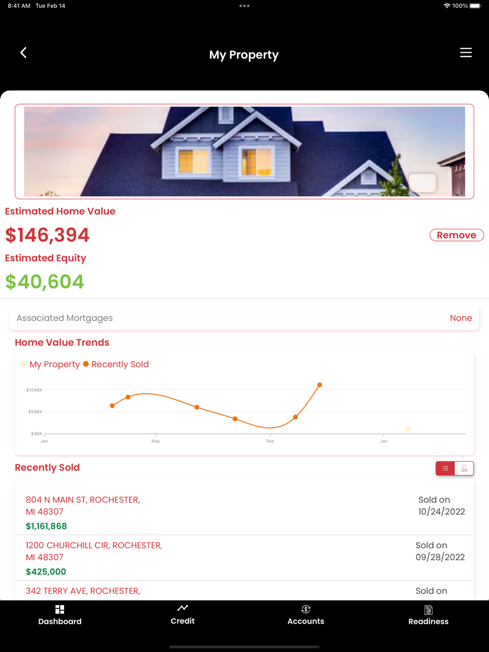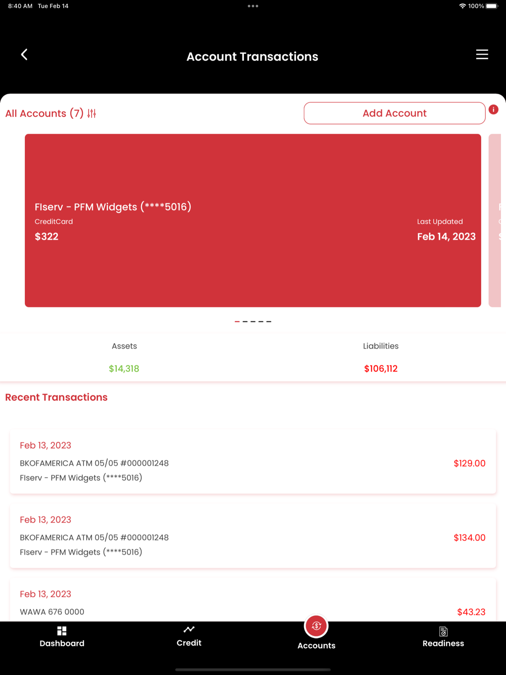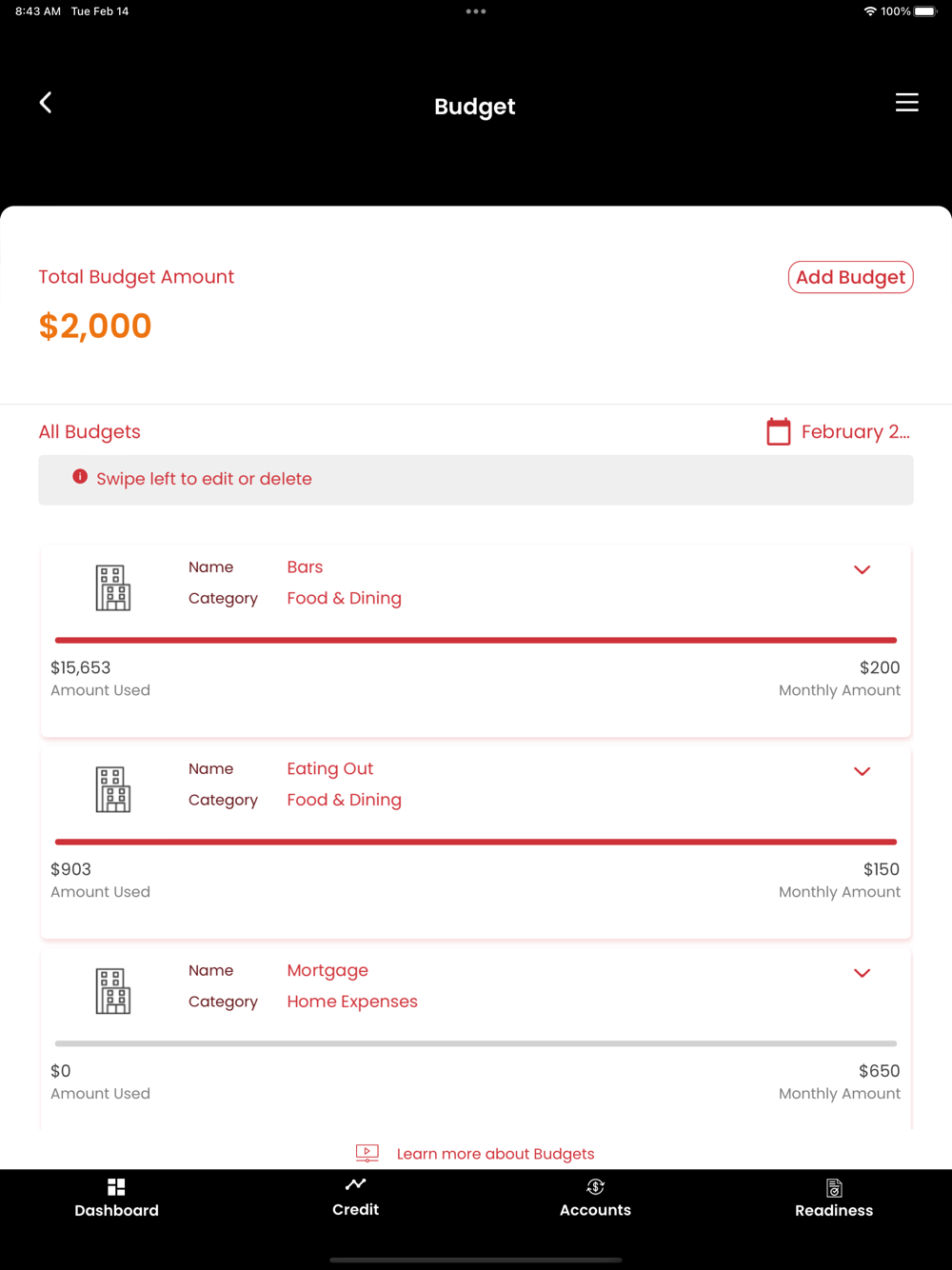 Your FinReady dashboard summarizes important financial information such as: account balances, transactions, net worth, budgeting, credit score, cash flow analysis, estimated home value, spending analysis, offers and promotions from your financial institution, and an information center with personal finance articles and videos, all in one place.