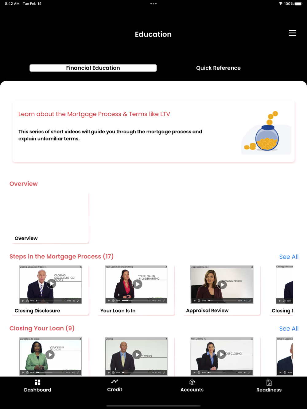 Work with your financial partner or institution to best prepare you for home ownership by planning for a down payment, establishing reserves, managing your debt to income ratio, improving or maintaining your credit, loan scenarios through our calculators, establish your projected loan to value, and more. Visit the readiness assessment in your app to see a snapshot of your credit overview, debt to income ratio, cash reserves, employment, down payment and sales price.