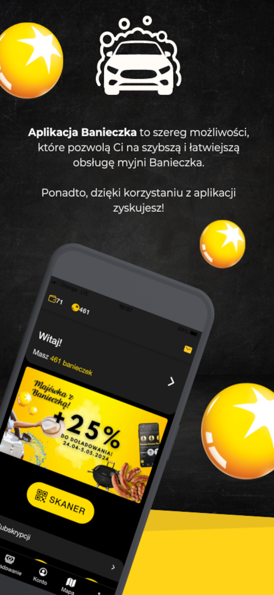 Aplikacja do płatności bezgotówkowych na bezdotykowych myjniach samochodowych. Aplikacja działa tylko na myjniach należących do sieci Banieczka.