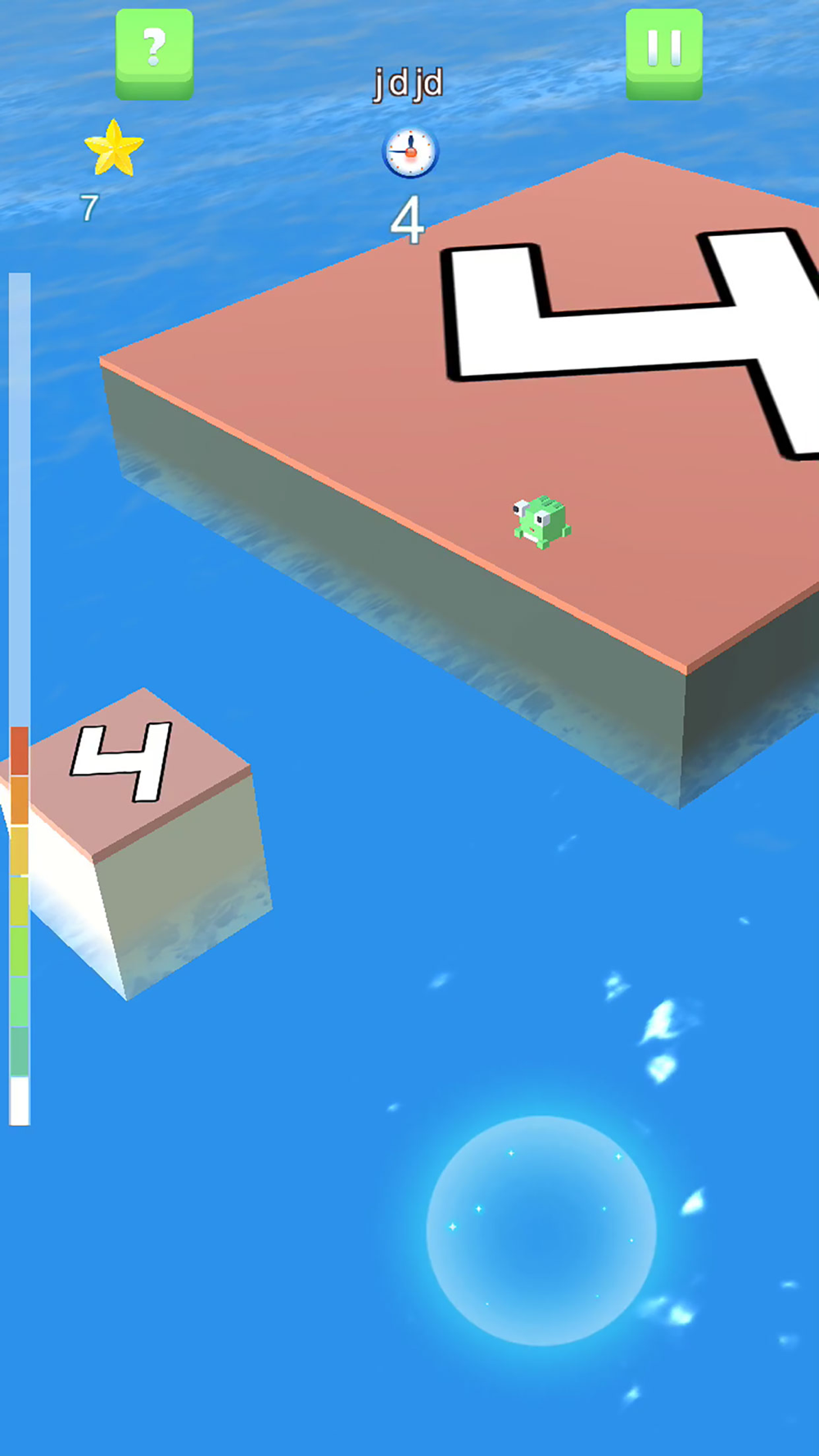 The player presses and holds the screen, and judges the distance the frog will jump by the color of the force on the left side of the screen, so as to jump to the opposite island.