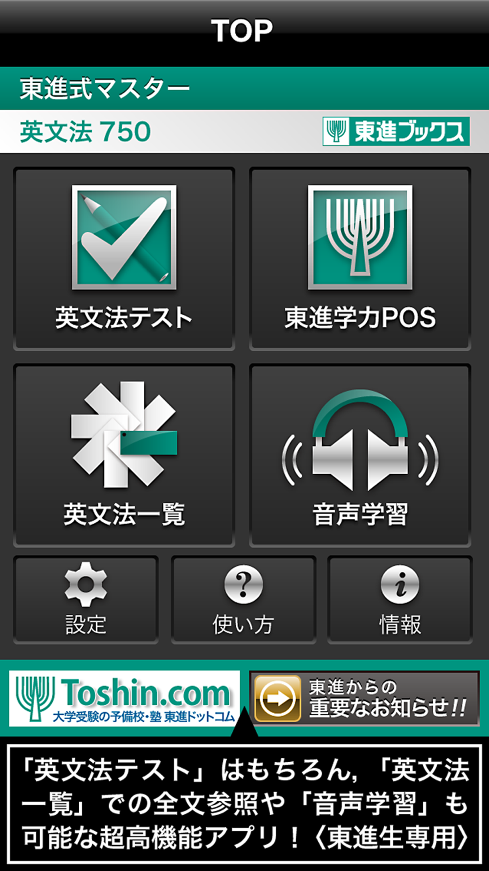 大学入試突破に必要な英文法を完璧に覚え、英語を本当に使えるものにするための、東進公式英文法アプリです。東進の現役合格メソッドにもとづいて作られた、高校生(大学受験生)が絶対に覚えておきたい必修・頻出の英文法。それがこの750問です。