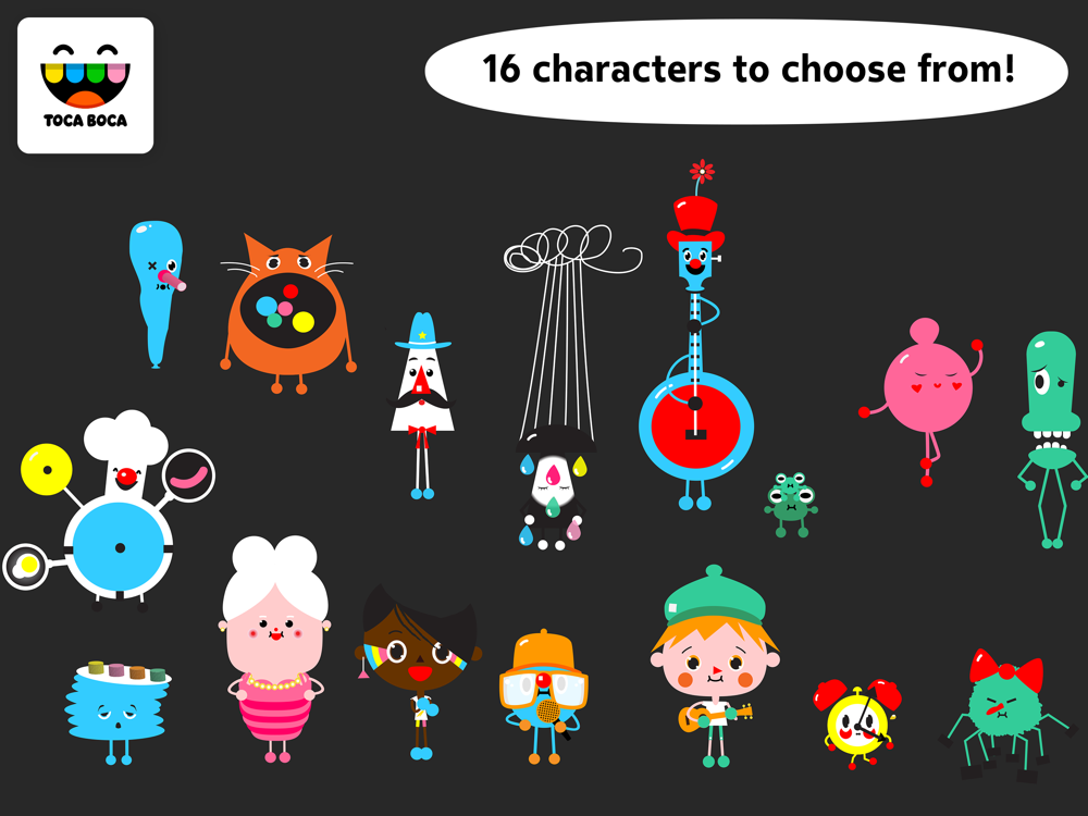 √ 16 colorful characters, each with their own unique sounds and moves!