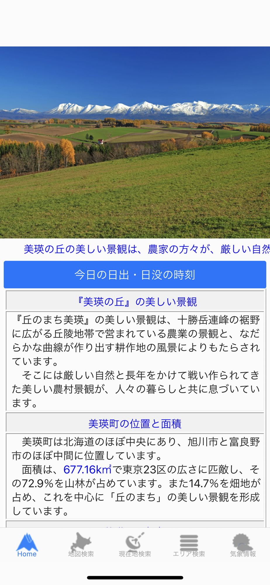 この『美瑛の丘をめぐる旅』は、その美しい美瑛の風景をよりいっそう満喫できるよう、地図や写真とともにビューポイント/撮影ポイントを紹介するアプリで、観光ガイド等に記載されていないようなビューポイントも多数紹介しております。