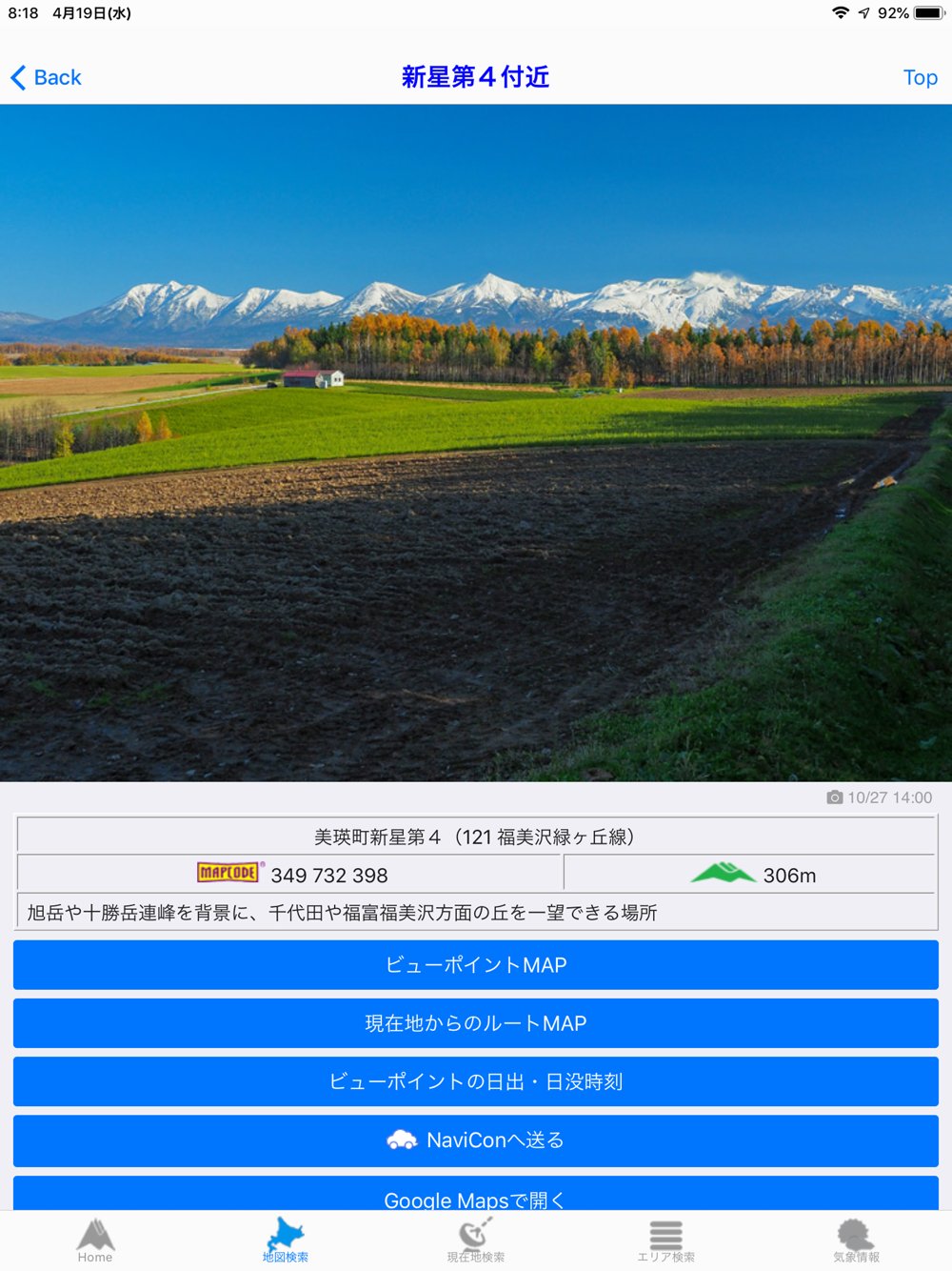 写真とともに住所、マップコード、簡単なコメントを表示します。ボタンが「ビューポイントMAP」と表示されている場合、そこをタップすると表示されている写真を実際に撮影した場所が航空写真で表示されます。ボタンが「被写体名称 MAP(例:「ケンとメリーの木MAP」等)」と表示されている場合、そこをタップすると被写体の場所が航空写真で表示されます。また、「現在地からのルートMAP」をタップすると、地図上にルートが表示されるととともに、地図上のアイコンをタップすると、「現在地からの直線距離」と「ルート上の移動距離」が吹き出し表示されます。