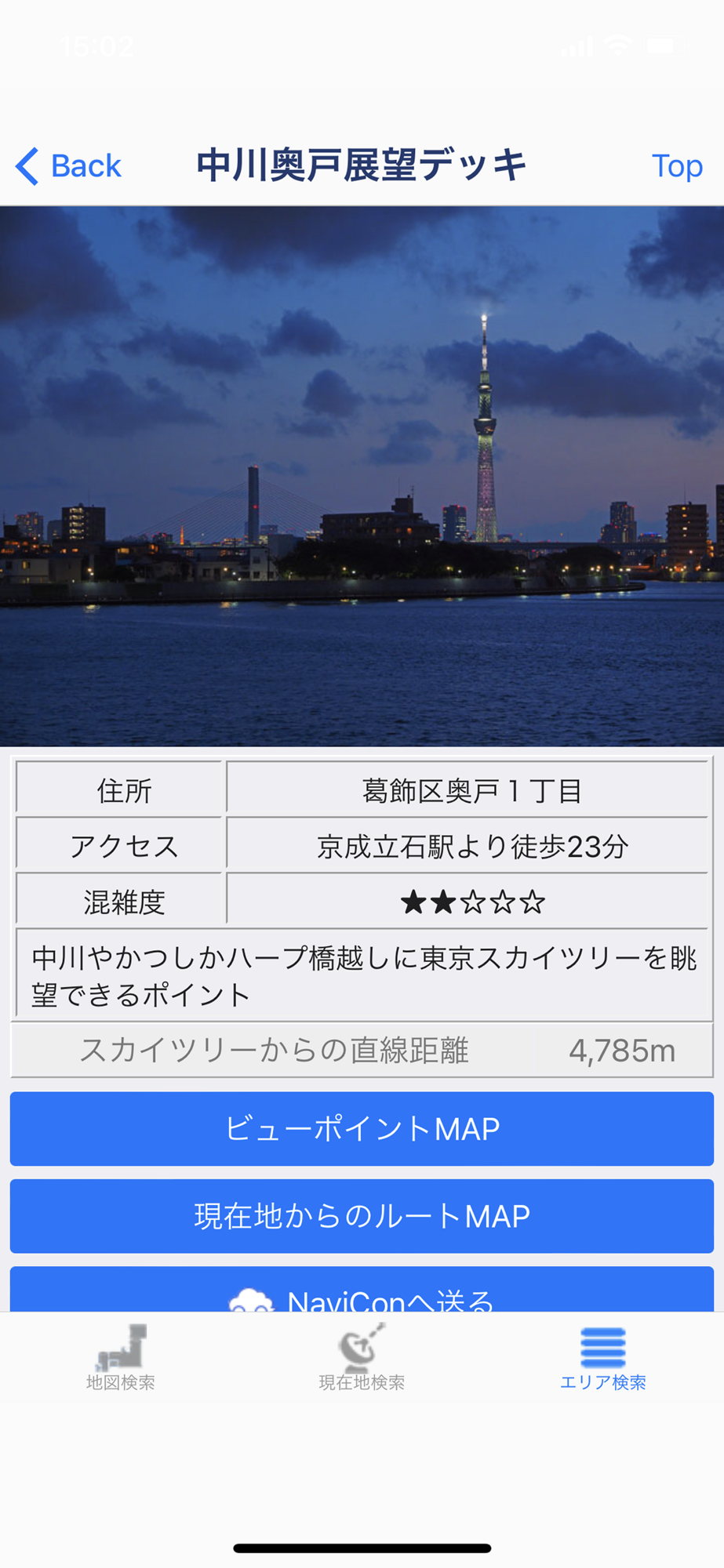 地図からビューポイントを検索します。地図上のアイコンをタップすると、ビューポイント名が表示されますので、そこをタップするとビューポイント情報が表示されます。