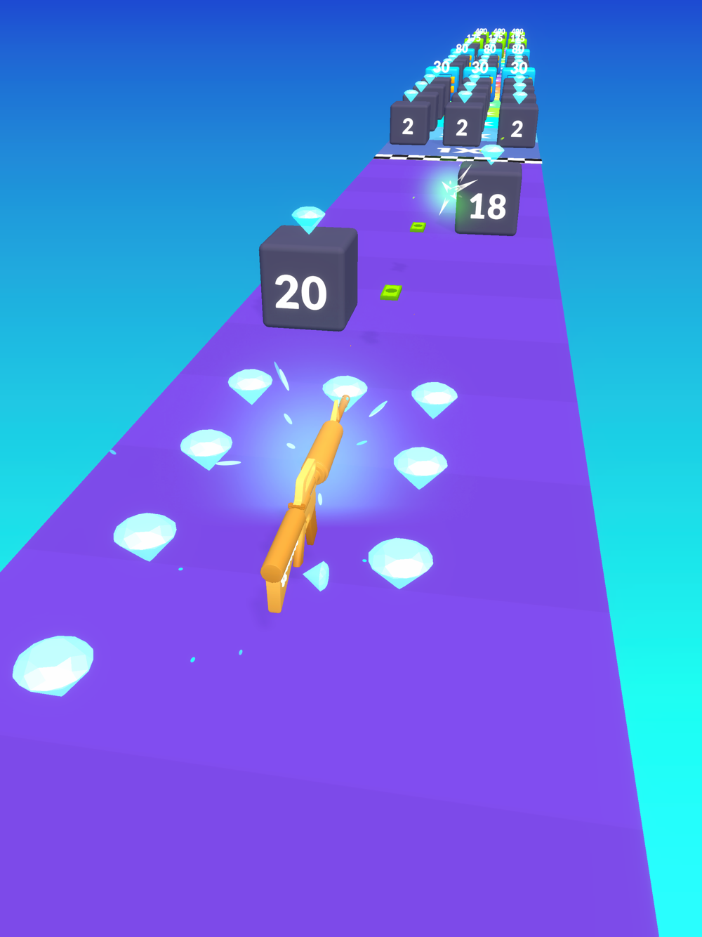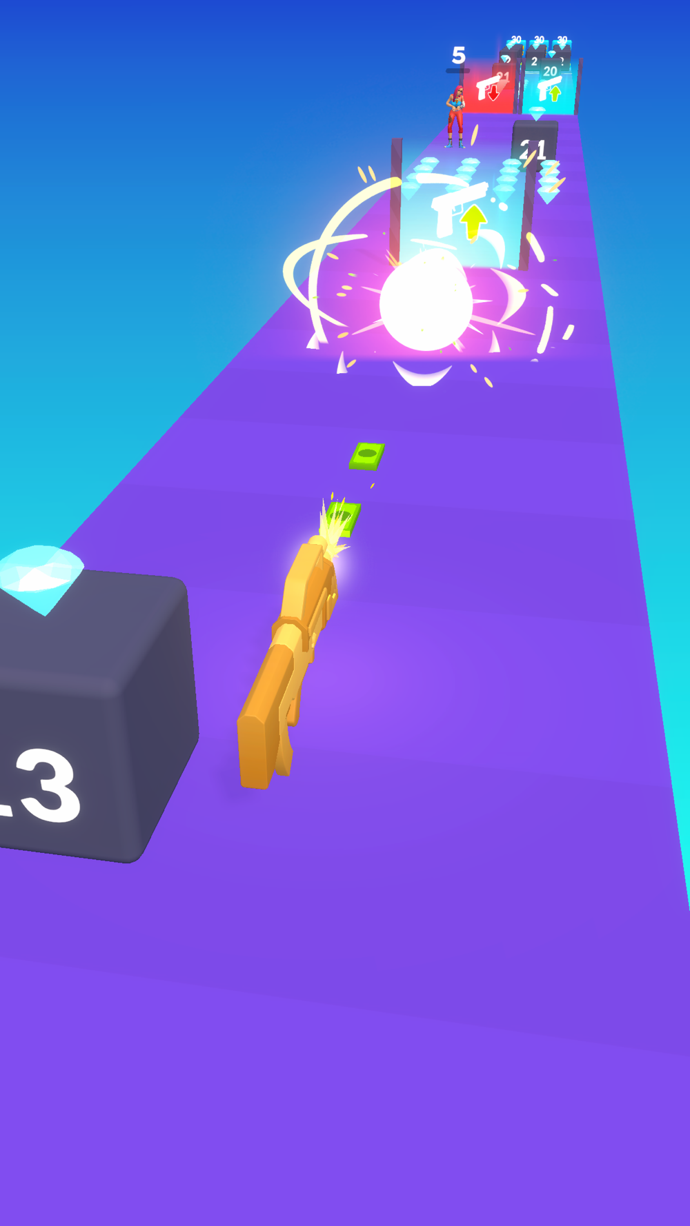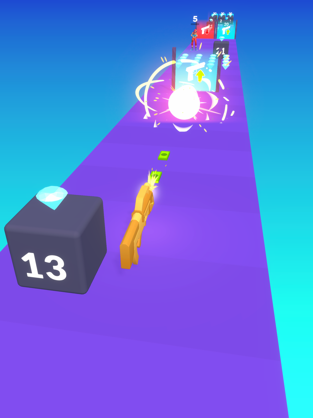 Collect gems! Collecting gems s the way to earn big and also upgrade your gun. Don't miss a single gem on the path.