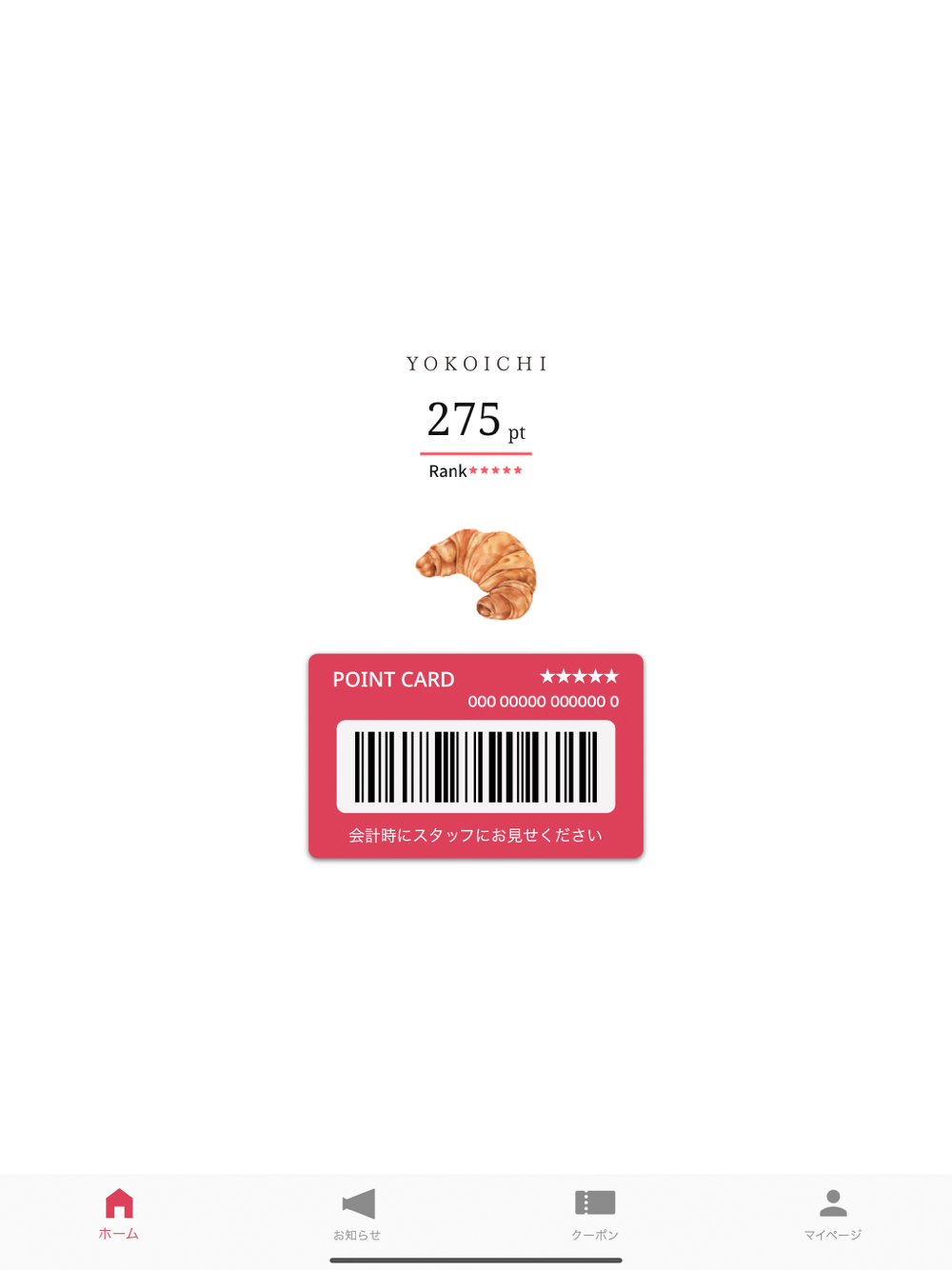 お会計時にホーム画面のバーコードをレジ読み取ることで会計の1%(小数点以下切り捨て)のポイントが貯まります。
