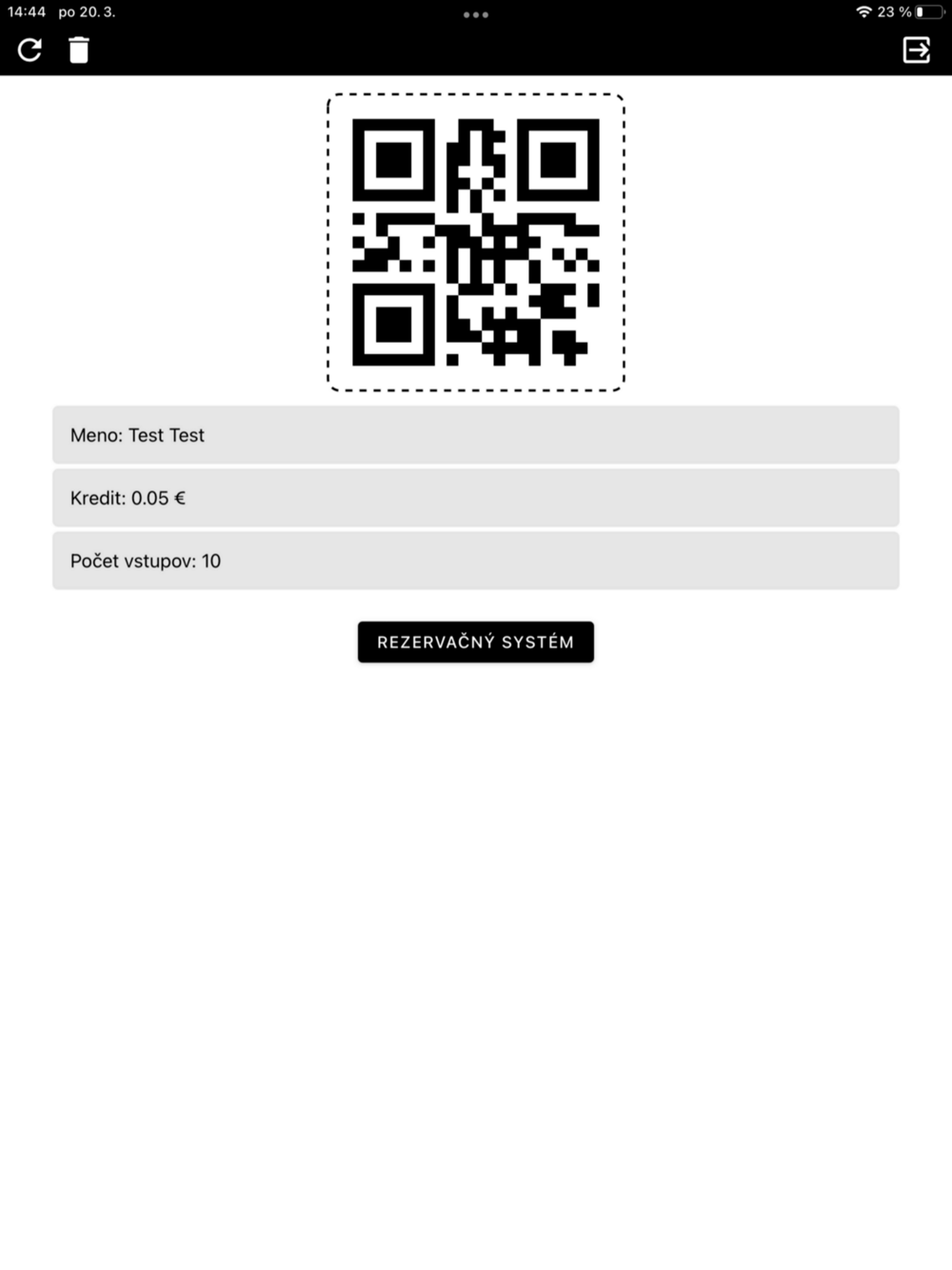 V aplikácii sa zaregistrovanému klientovi po prihlásení zobrazí jeho aktuálny stav kreditu, permanentky a jeho identifikačný QR kód.
