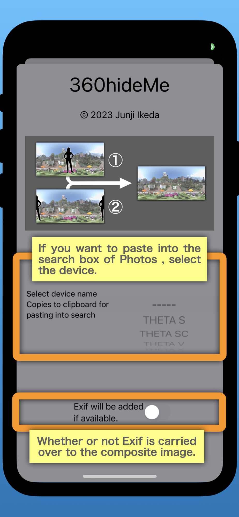 360hideMe merges parts of two 360-degree images where the photographer is not visible.