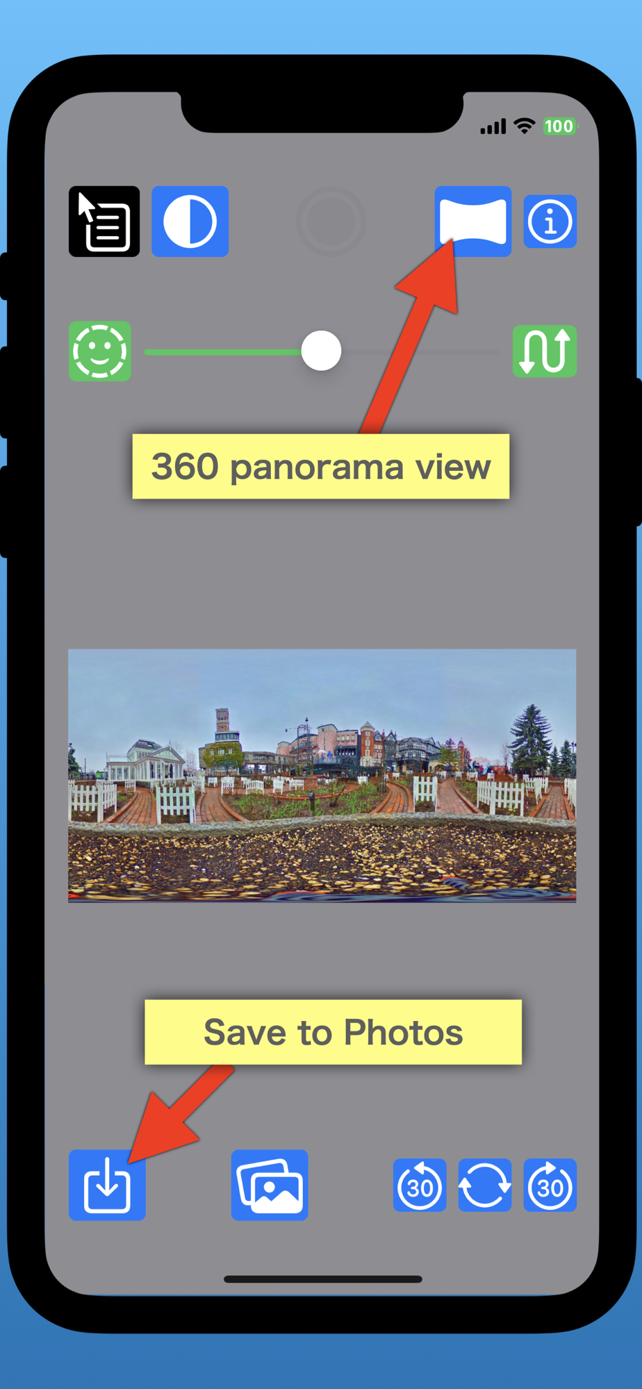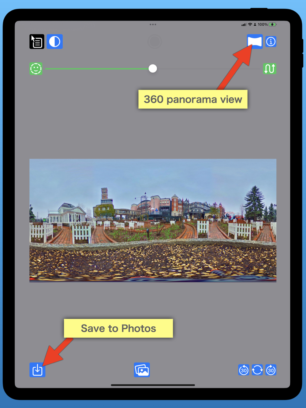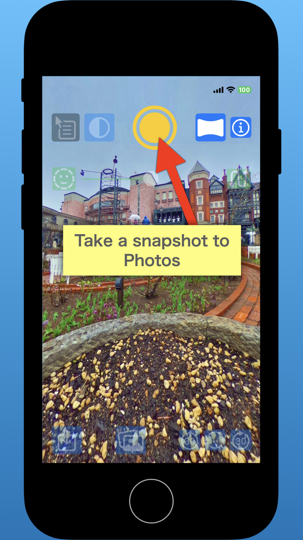 You can switch between the 360-degree image and 360-degree panorama view with the panorama button on the upper right side. In the state of 360-degree panorama view, you can take a snapshot with the button in the center of the top edge. It will be saved in the photo album.