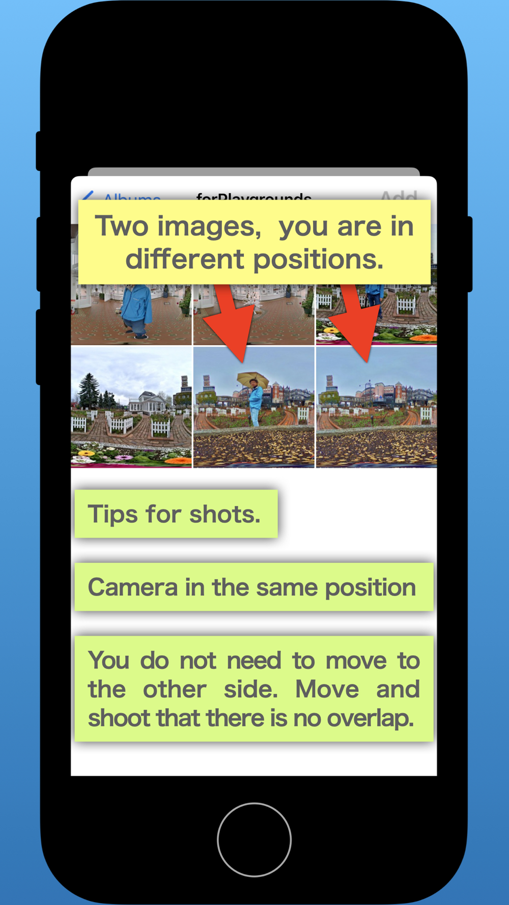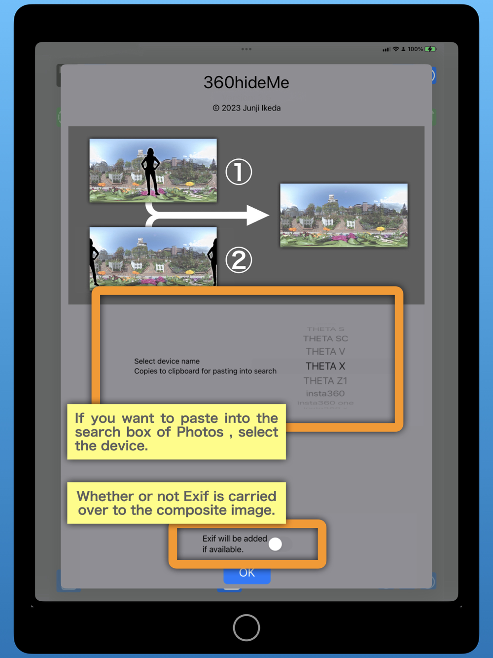 With a 360-degree camera, all directions are captured, including the photographer. There are methods to avoid the photographer from appearing in the shot, such as using a timer or remote control and hiding during the shot, but there may be situations where you cannot move away from the camera or there is nowhere to hide. There are 360-degree cameras with a function to erase the photographer, but this requires switching shooting modes and taking the shot twice, which can be cumbersome. 360hideMe can load images shot twice with your usual shooting app and erase the photographer.