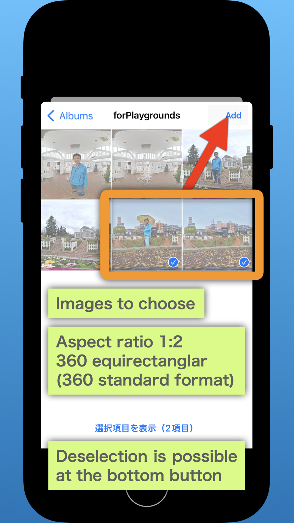 Photos with an aspect ratio of 1:2 for 360-degree images (equirectangular) and file format of JPEG or PNG can be applied. This is a standard aspect ratio and file format for general 360-degree cameras.