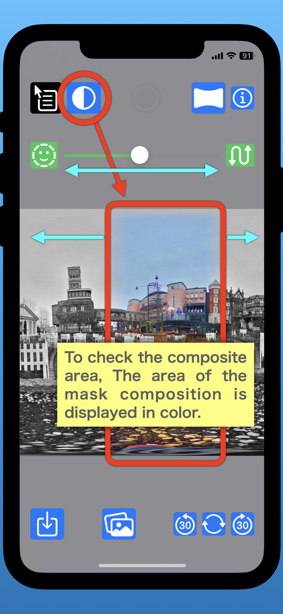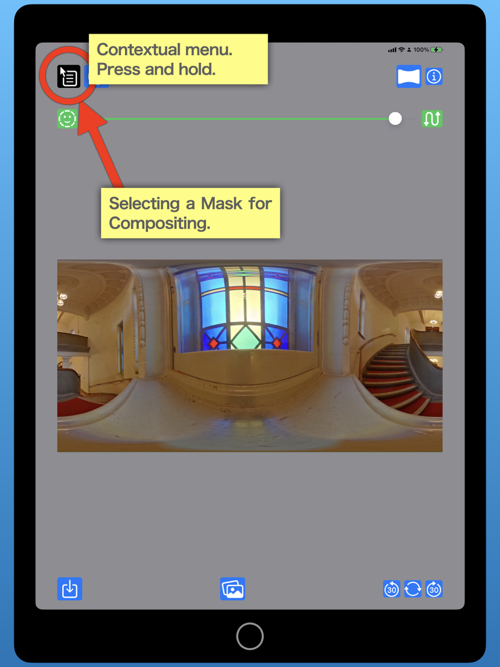 Tap the button in the center of the bottom of the screen to select photos from the album. Select two 360-degree photos. The merged 360-degree image will be displayed. You can adjust the effect with the controls lined up on top of the 360-degree image. Left end: Automatic adjustment by face recognition. Center slider: Adjustment of mask position movement. Right end: Swap the order of the loaded 360-degree images. With the three buttons at the bottom right, you can move the edges of the 360-degree image stitching. Save the merged 360-degree image to the photo album with the button at the bottom left. If you want to change the finish of the composite range and composite edge, the mask menu will be displayed in the context menu (long press the button) at the top left.