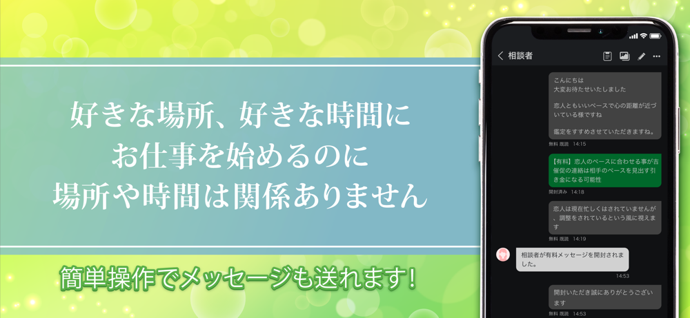当アプリでは、それぞれのカウンセラーの得意とするジャンルに関する悩みを抱えたユーザーに対し、チャットにて受信した相談へのカウンセリングを行うことができます。