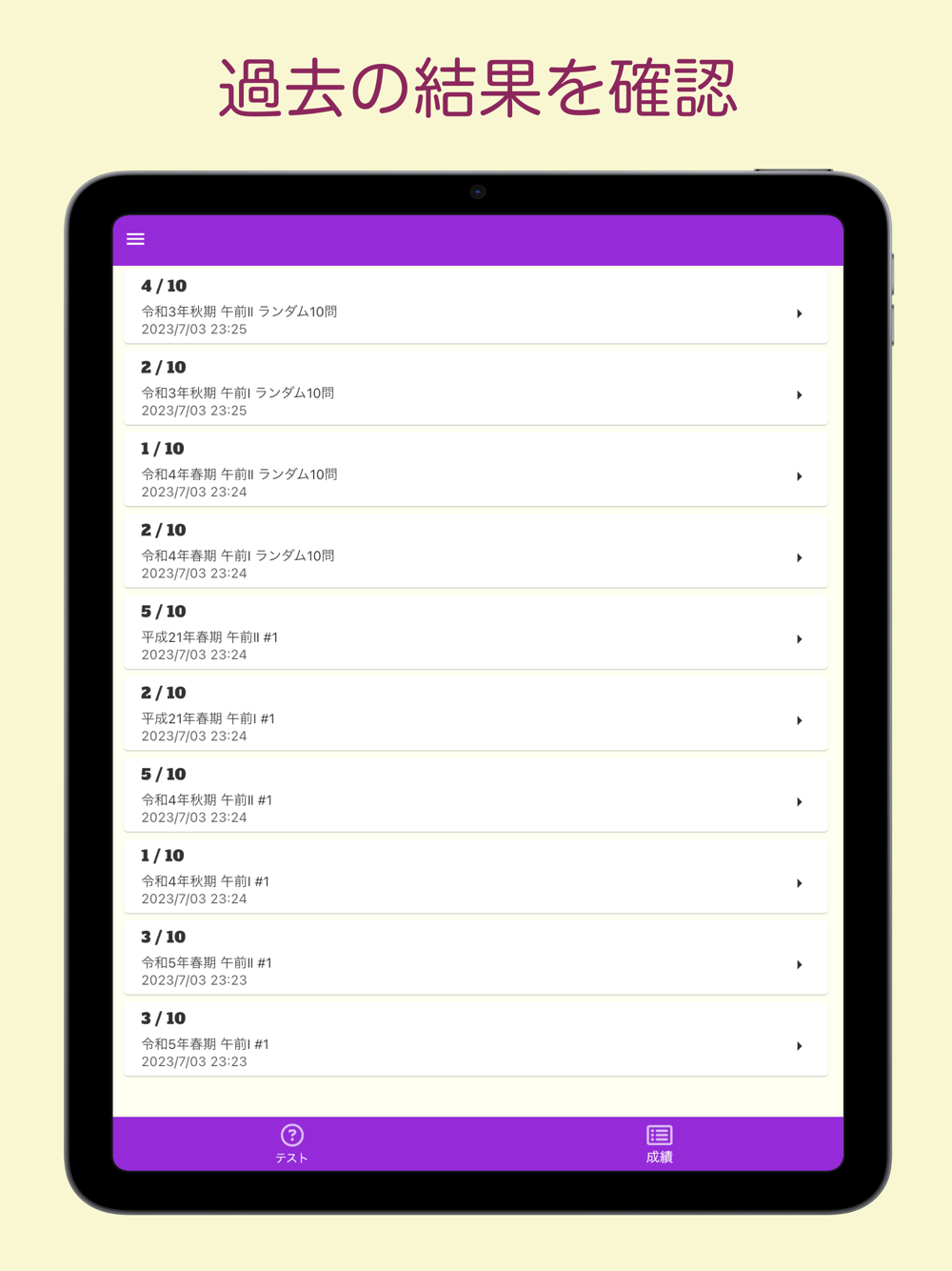実施した問題については履歴から確認し、間違った問題を復習できます。