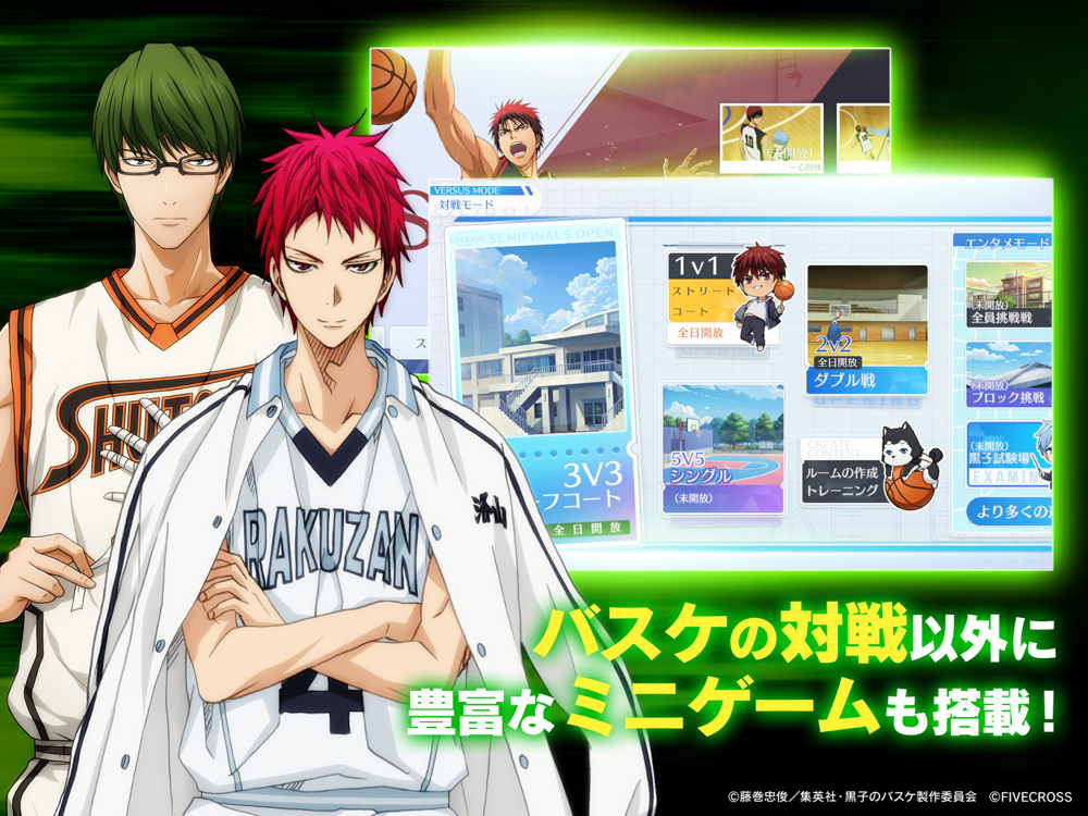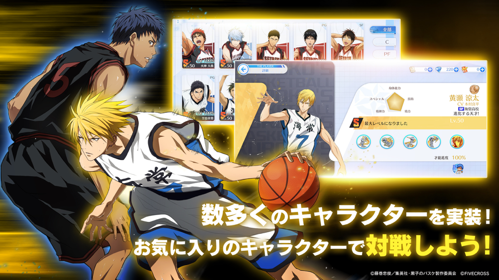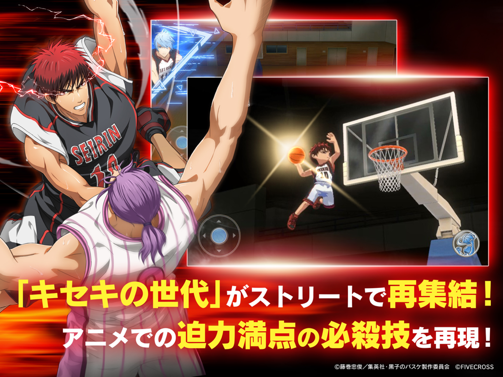 アニメ『黒子のバスケ』公式初の完全新作3Dバスケ対戦スマホゲーム「黒子のバスケ Street Rivals」(略称:黒バスSR)。本作は『黒子のバスケ』の世界を忠実に再現し、プレイヤーは「黒子テツヤ」「火神大我」を含む数多くのキャラクターたちを育成しながら、アニメでの白熱のバスケの試合をリアルに体験することができます。また、さまざまな試合モードを搭載し、今ふたたび「黒子のバスケ」の興奮と感動を呼び覚まします!