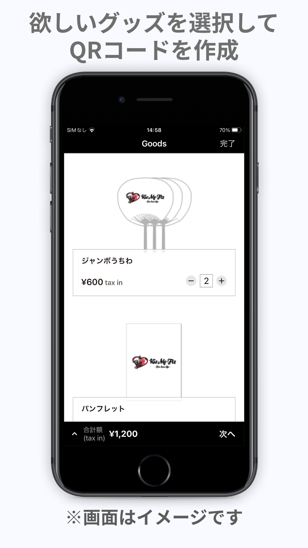Kis-My-Ft2 「Kis-My-Ft2 -For dear life-」のコンサート会場で、購入したいグッズをあらかじめリスト化しておき、レジでQRコードを提示するだけで簡単に注文ができるアプリです。