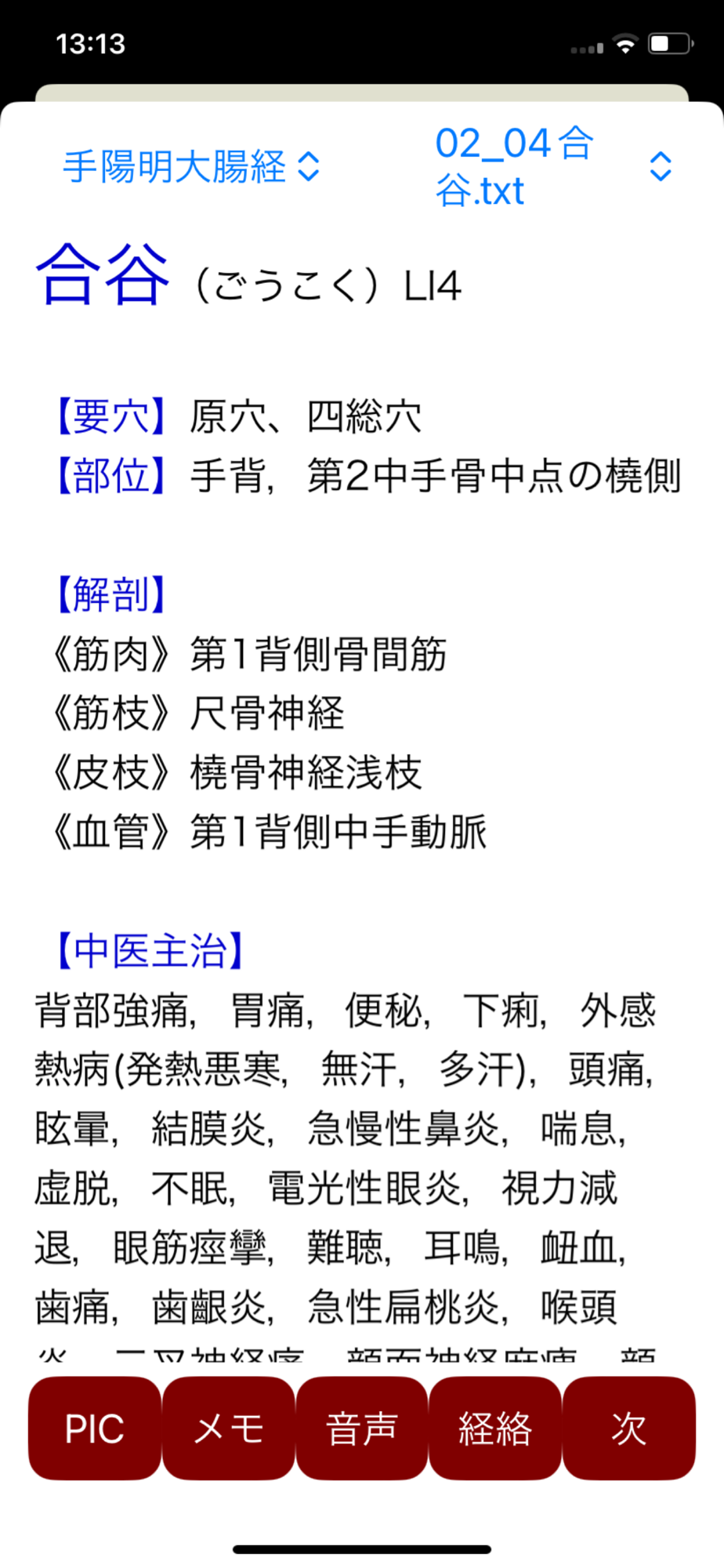 ◉経穴の名称に加え、要穴・部位・解剖情報《筋肉・神経・血管》を、AI音声(女性)が話してくれます。