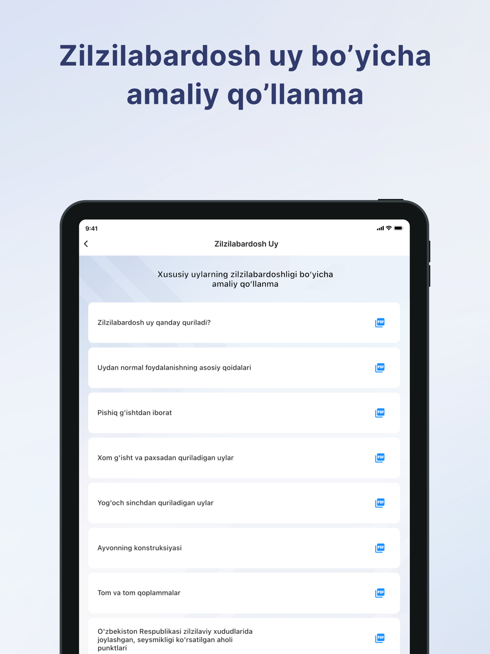 Zilzilabardosh uy - Ilova zilzilabardosh uylarni qurish to‘g‘risidagi ma’lumotlarni hamda zilzilabardosh uy-joylarning namuna loyihalarni kiritish va amaliy qo'llanmalarni o'z ichiga oladi.