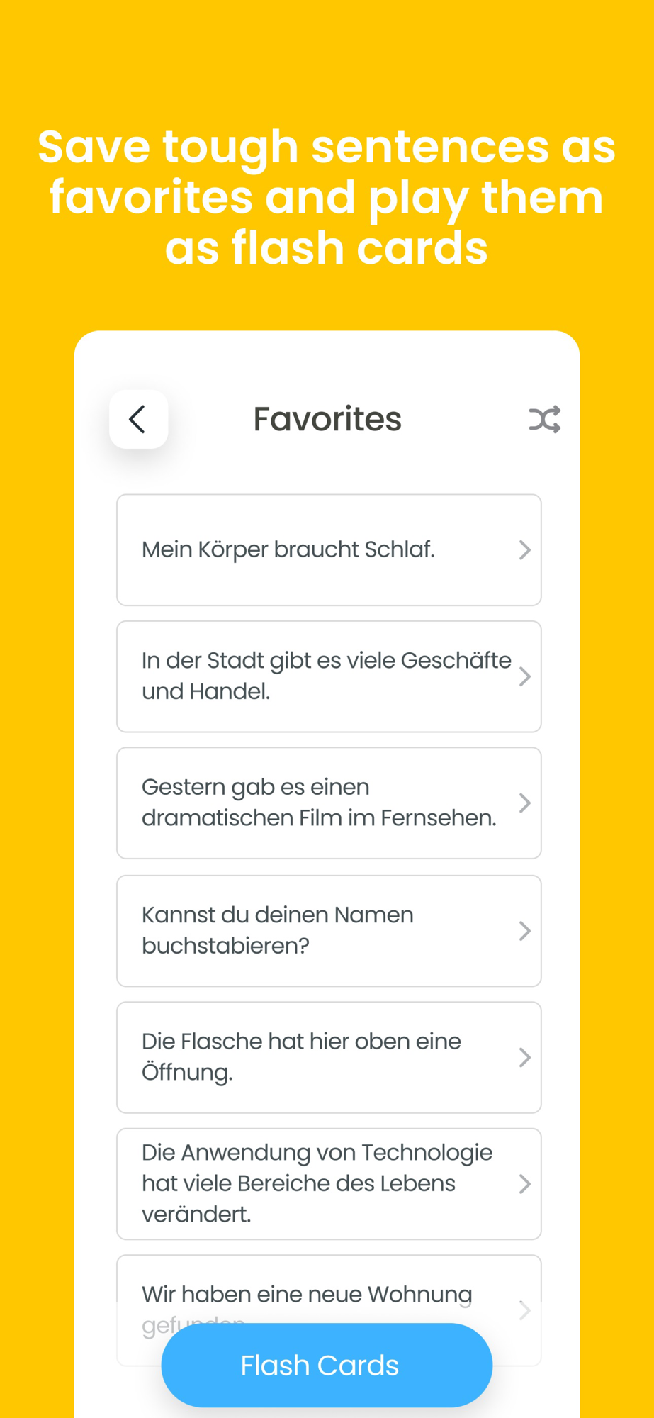 * Favorites for Quick Review: Save useful phrases to your favorites and revisit them anytime in a flashcard format. This quick rehearsal boosts recall and cements your learning.