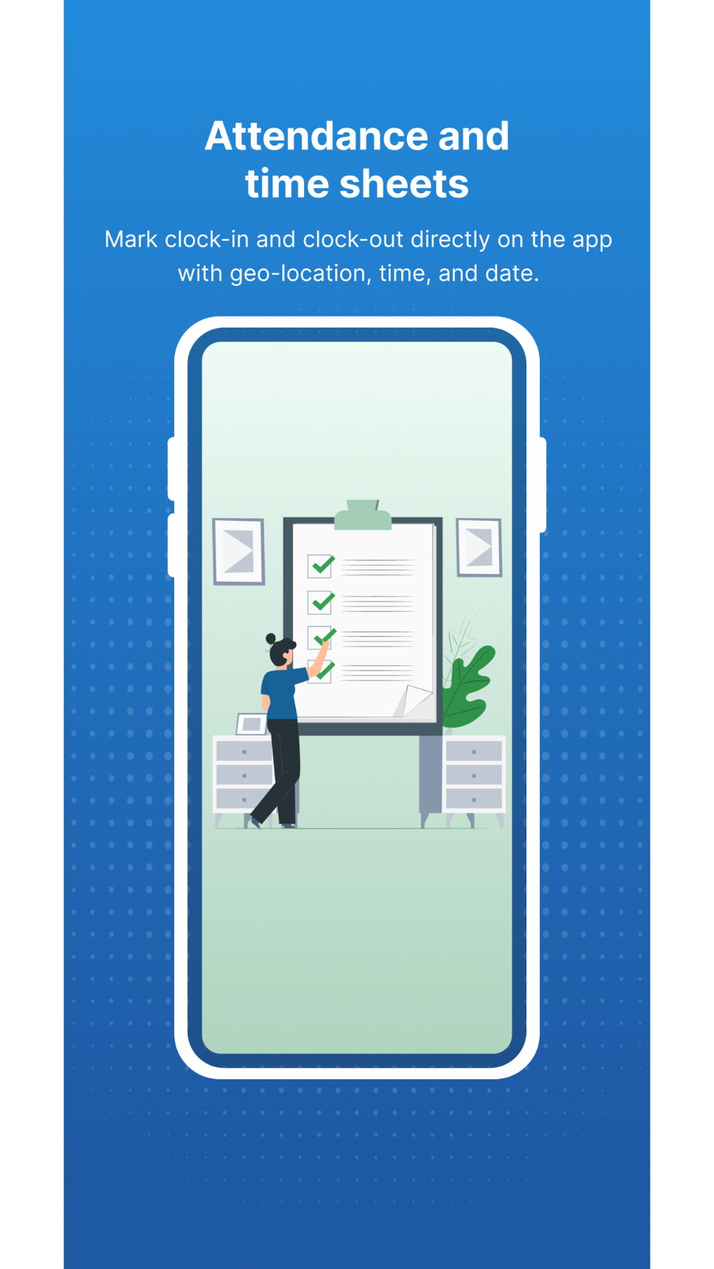 - Attendance and time sheets- Mark clock-in and clock-out directly on the app with geo-location, time, and date.