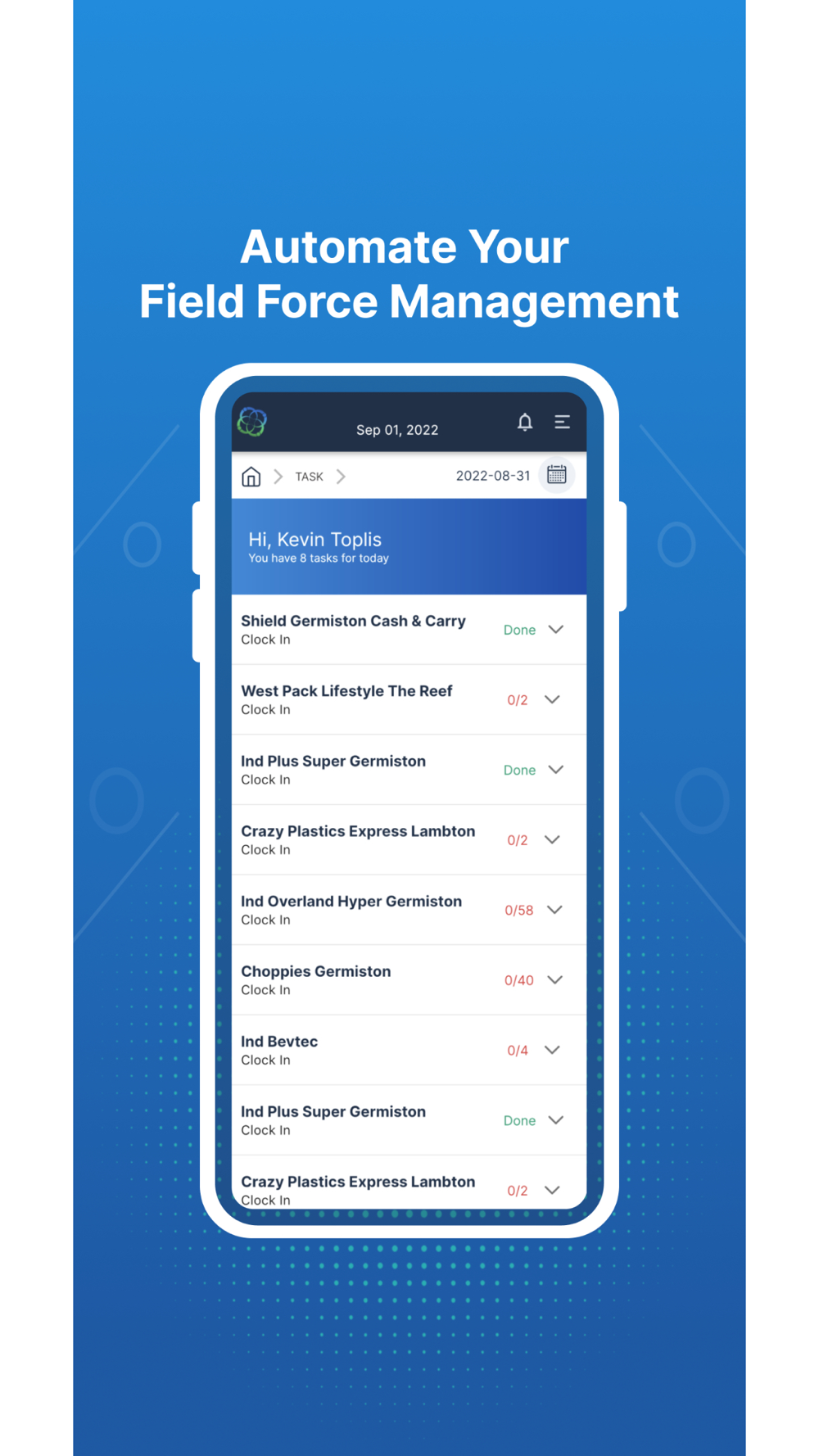 - Task management- Manage field tasks and break times. Get geo-tagged reports including reasons for clocking out.