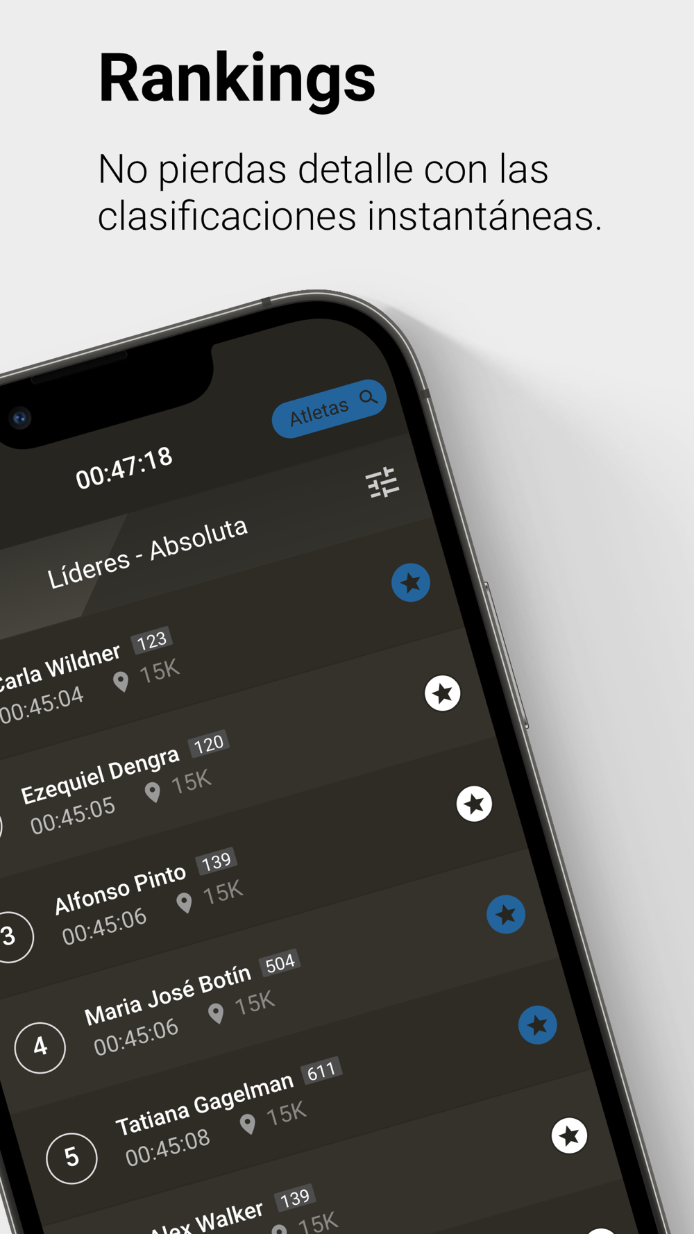 Además, podrás ver de forma rápida cualquier clasificación al instante: por categorías, los primeros corredores por tramo y el último punto alcanzado de los participantes a los que sigas.