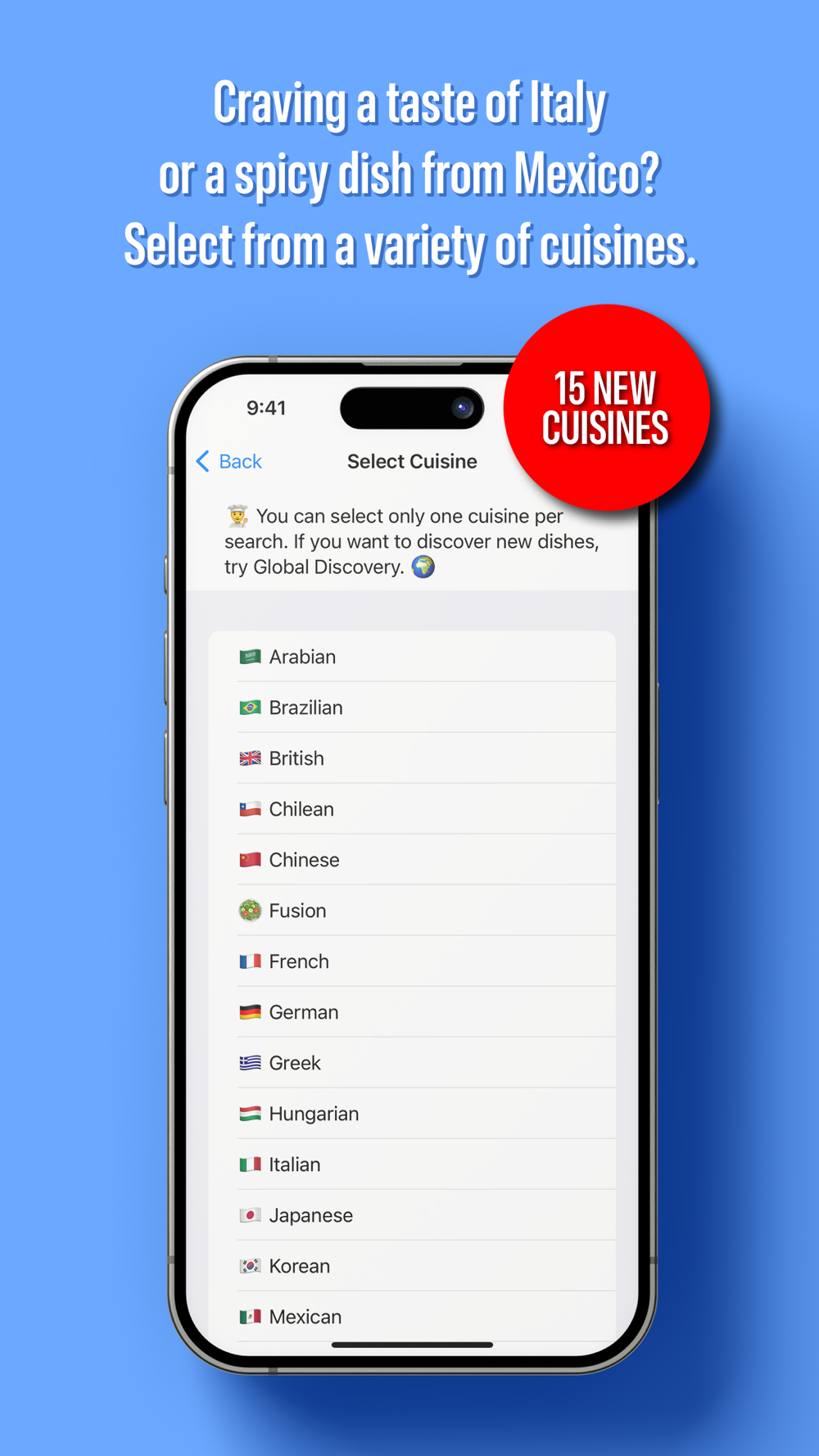 Craving a taste of Italy or a spicy dish from Mexico? Select from a variety of cuisines including African, Arabian, Brazilian, British, Caucasian, Central Asian, Chilean, Chinese, French, Fusion, German, Greek, Hungarian, Indian, Italian, Japanese, Korean, Mexican, Moroccan, North American, Peruvian, Portuguese, Scandinavian, Slavic, South American, Southeast Asian, Spanish, Turkish, or explore our Global Discovery category for something new and exciting.