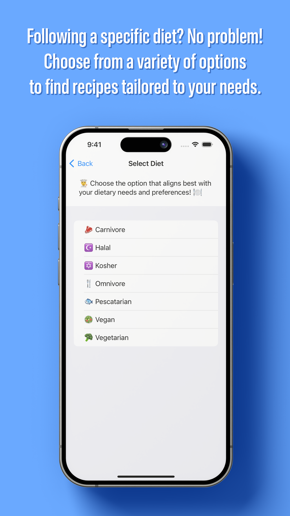 Following a specific diet? No problem! Choose from options like Carnivore, Halal, Kosher, Omnivore, Pescatarian, Vegan, or Vegetarian to find recipes that fit your dietary needs.
