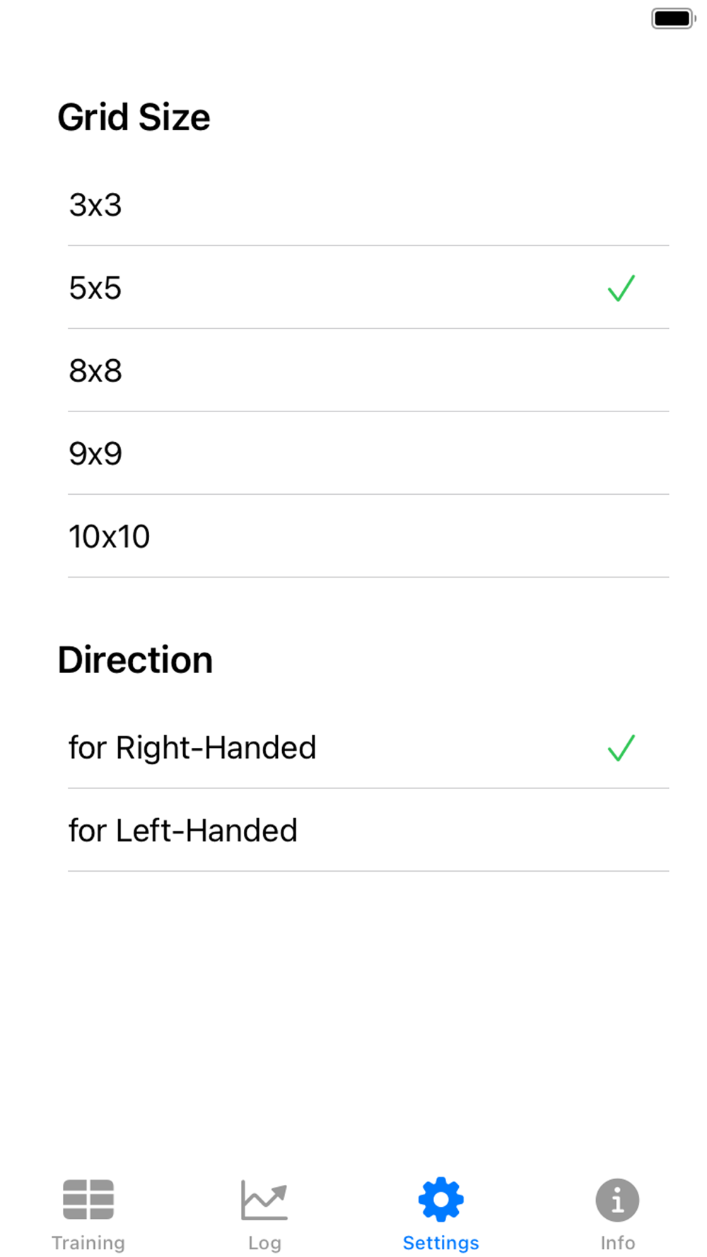 In the settings tab, you can set the grid size and whether you are right-handed or left-handed.