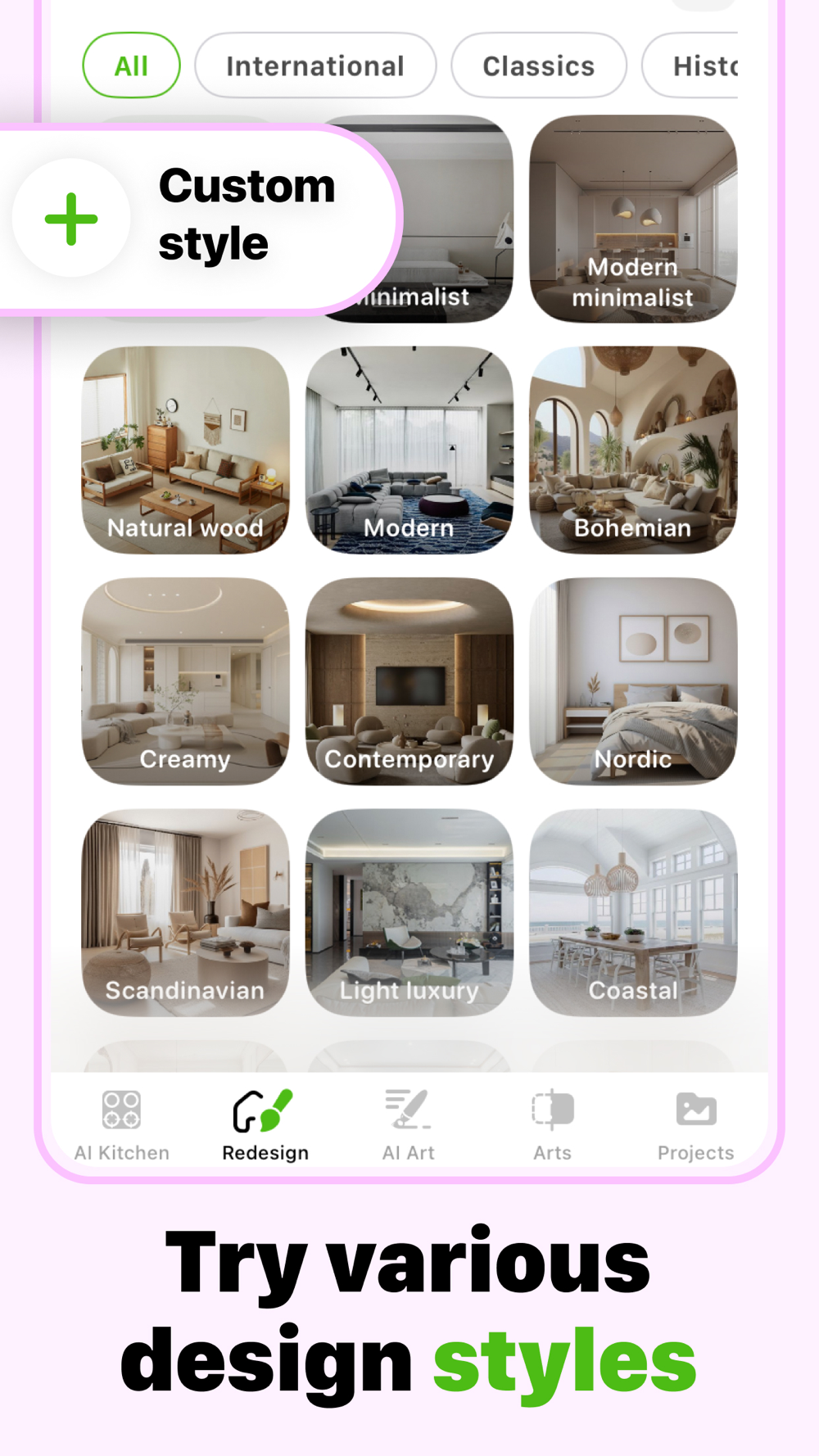 - Diverse Style Selection: Explore over 50 different interior design styles. Whether you love modern, industrial, tropical, zen, or any other style, our app has you covered. Mix and match to find the perfect fit for your taste.