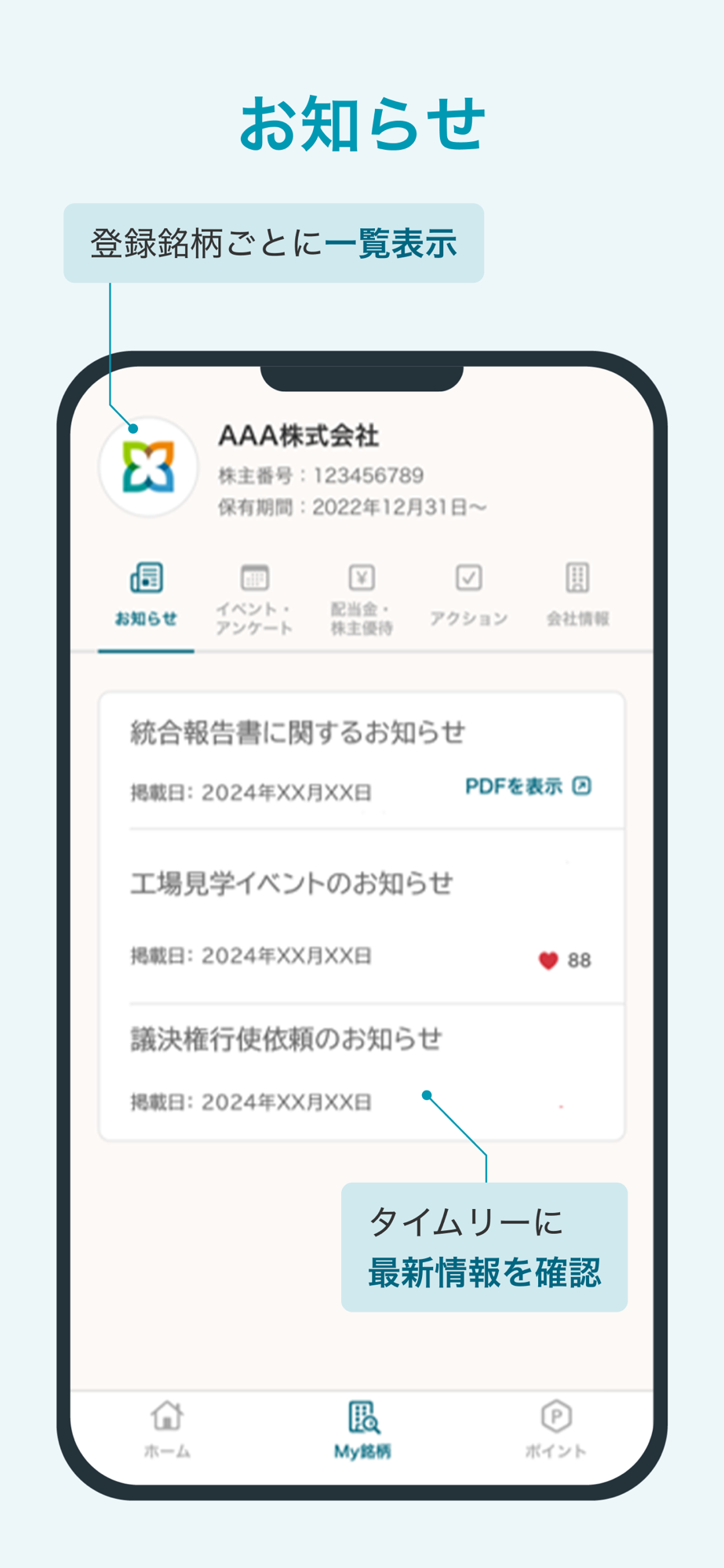 登録いただいた銘柄の総会情報、配当金情報、株主優待(※3)、イベント(※3)など、企業からの各種通知物を一括管理できます