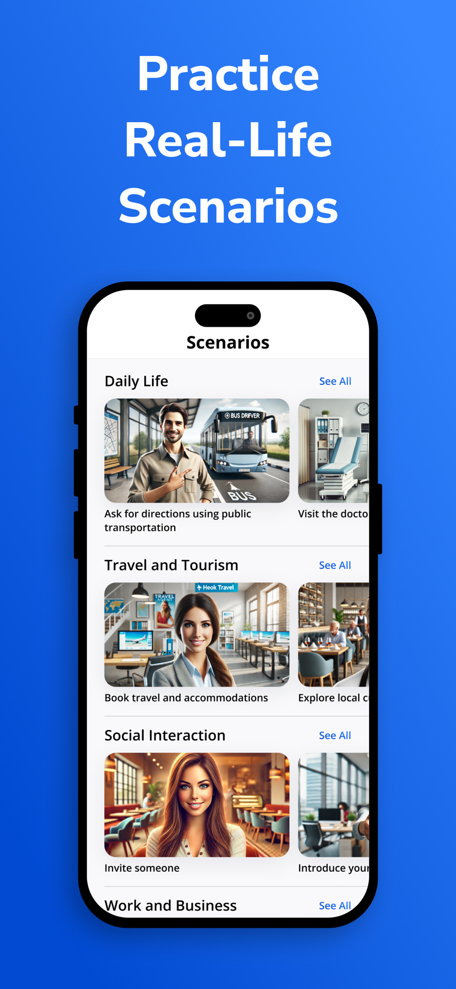 Language learning becomes more engaging and relevant when you’re immersed in real-world contexts. With Vocha, you can practice realistic conversations in different scenarios—whether you’re speaking English, Spanish, French, or any other language. Master essential interactions like ordering food at a restaurant, checking into a hotel, navigating airport conversations, making small talk with new friends, or even presenting in a work meeting. Vocha lets you create your own custom scenarios too, so you’re always preparing for situations that matter most to you.