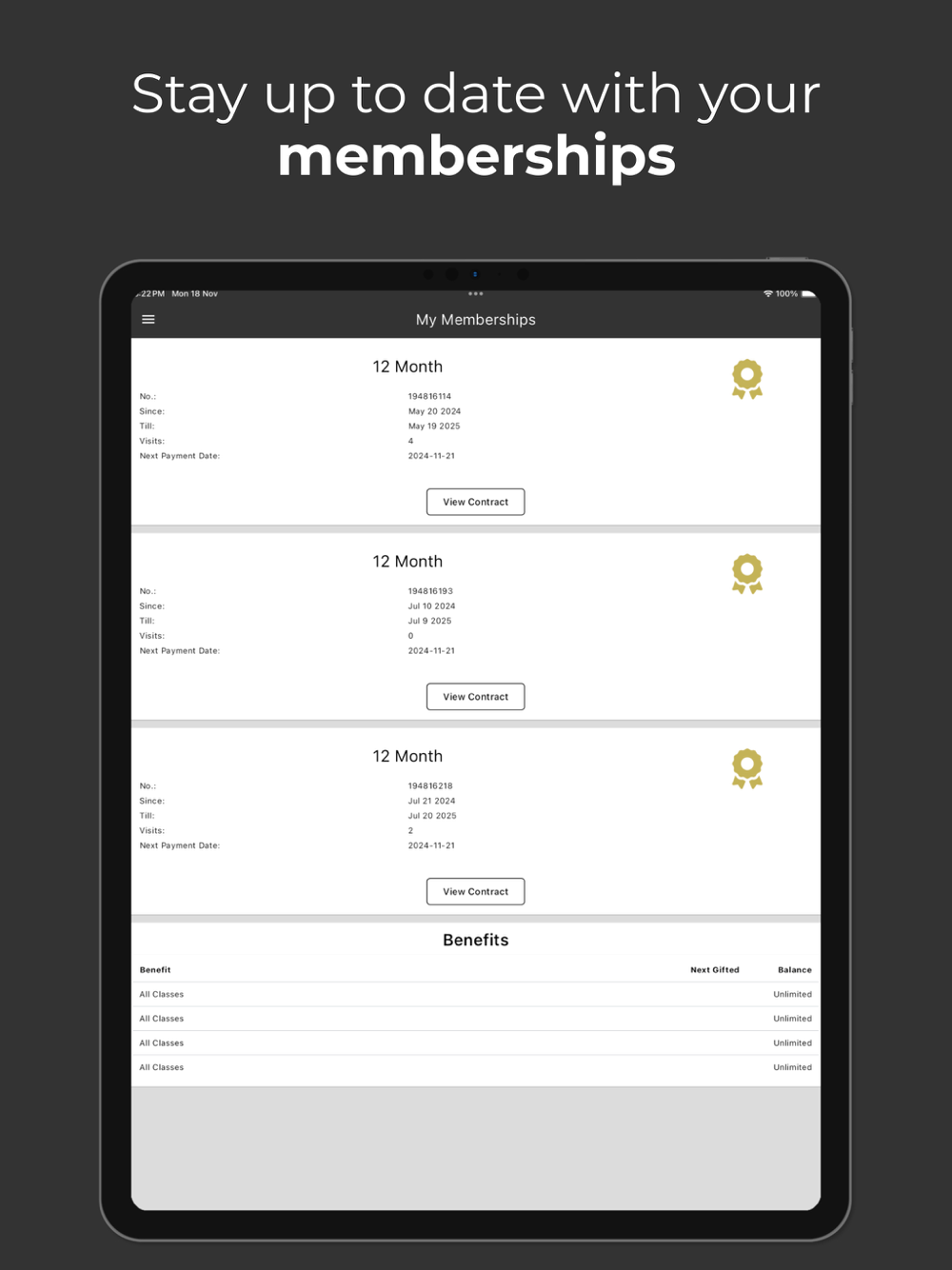 Easily view your gym's full timetable in real time. You can see who's running the class, whether the class is full and quickly secure your spot with the push of a button.