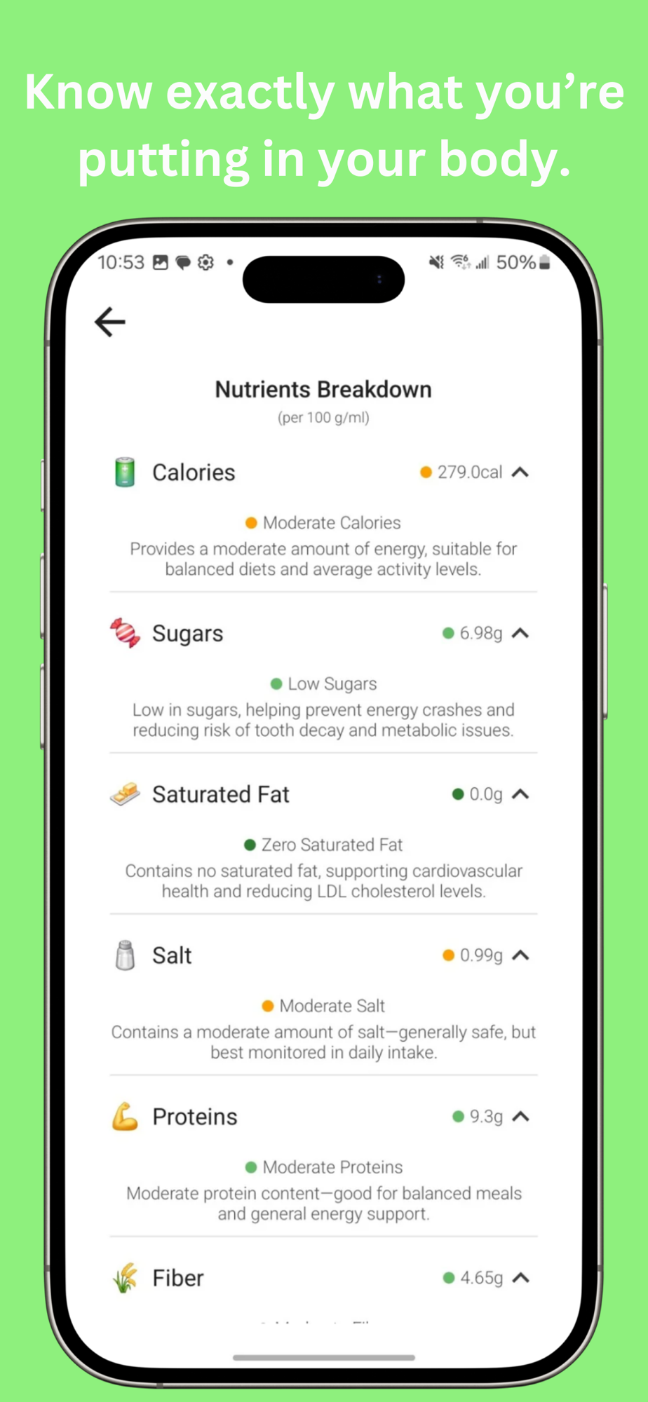 - Nutrient Breakdown – Sugar, fat, salt, fiber & more, color-coded for clarity