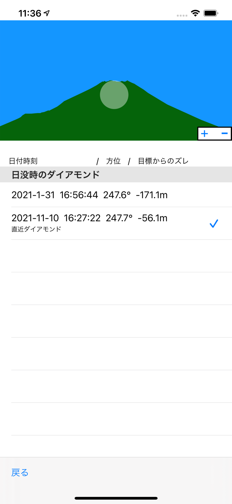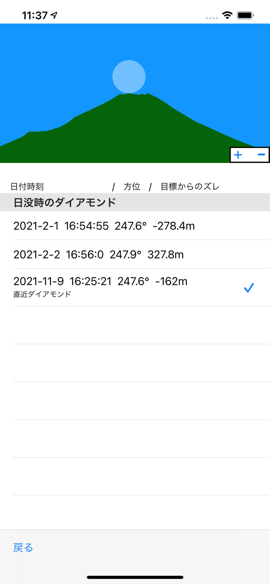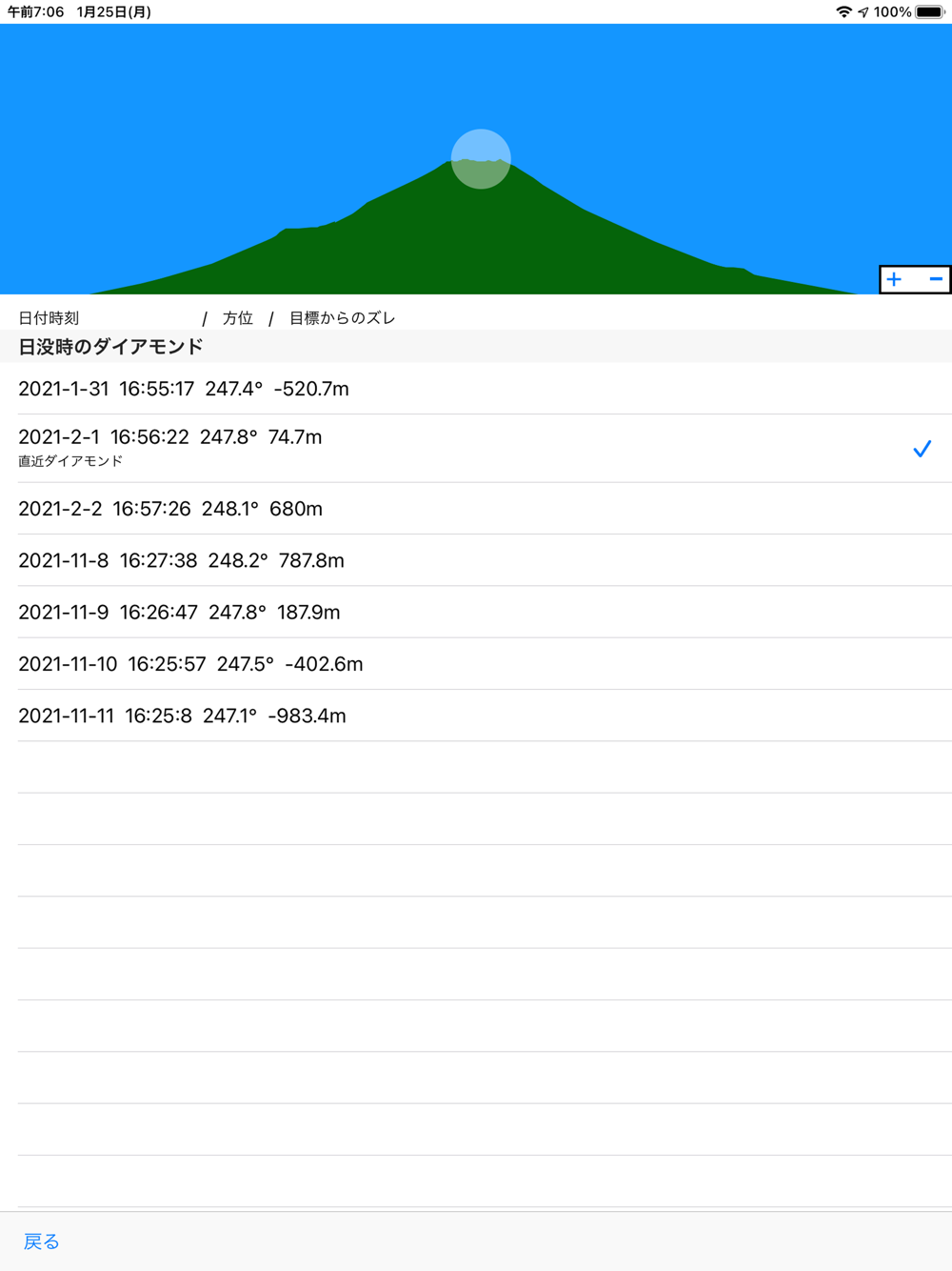 このアプリは「Diamond X」の後継アプリで、ダイアモンド富士の日時が簡単にわかります。