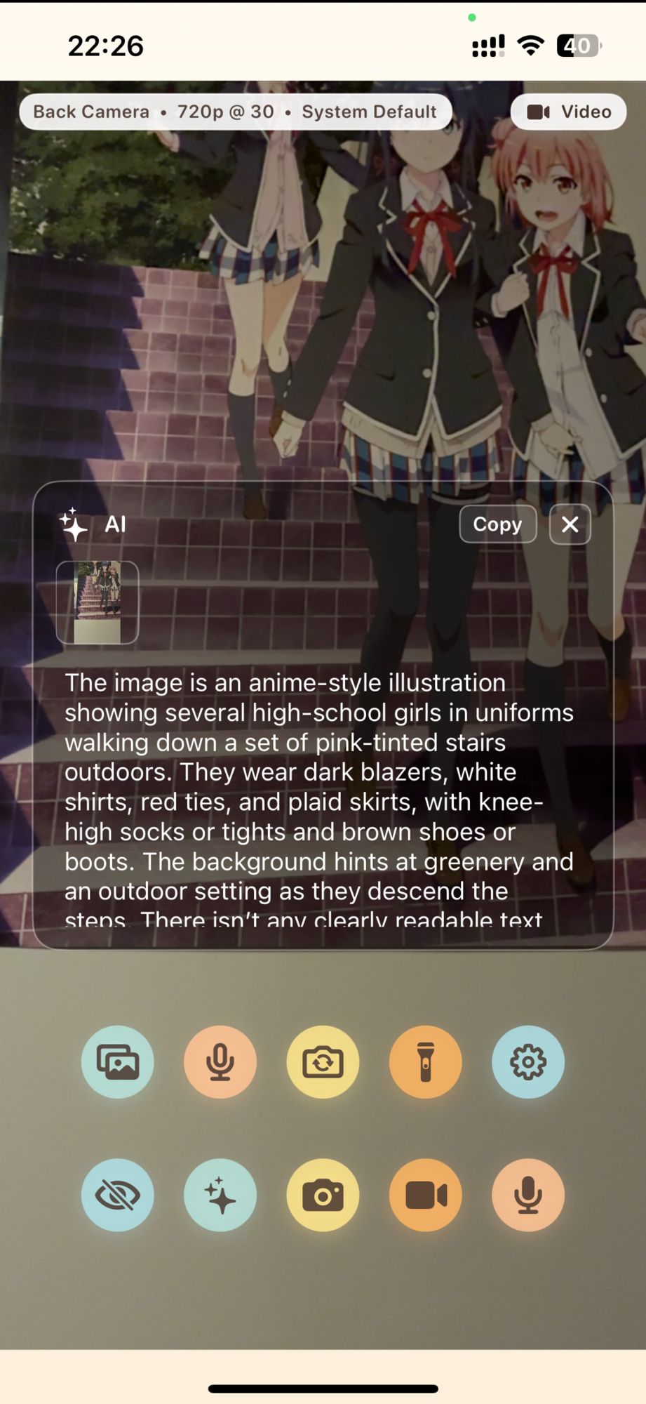 The app snaps a quick photo, sends it to AI, and streams back a caption/analysis.