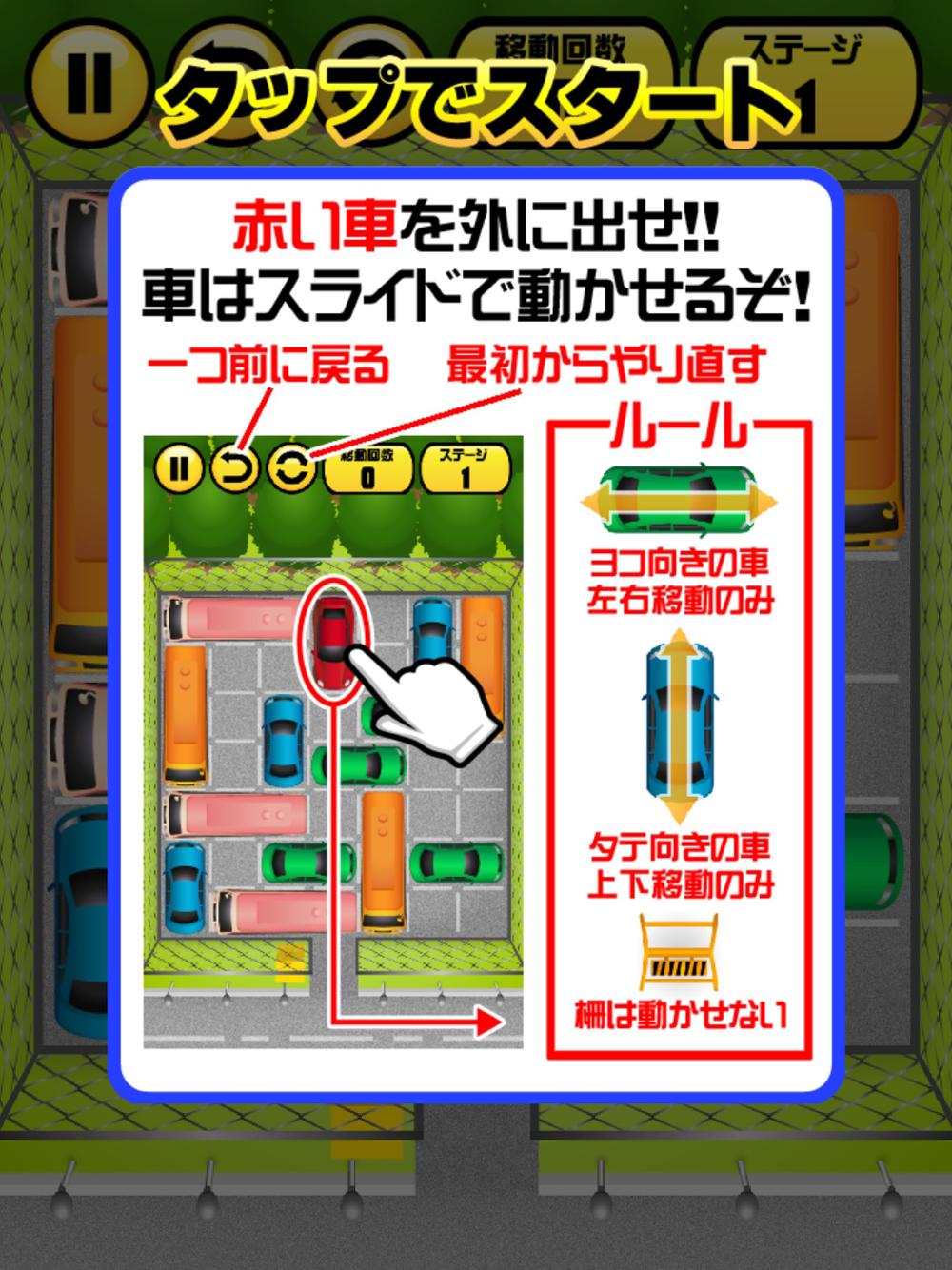 邪魔な車をスライドで移動させて、赤い車を出口へ誘導します。
