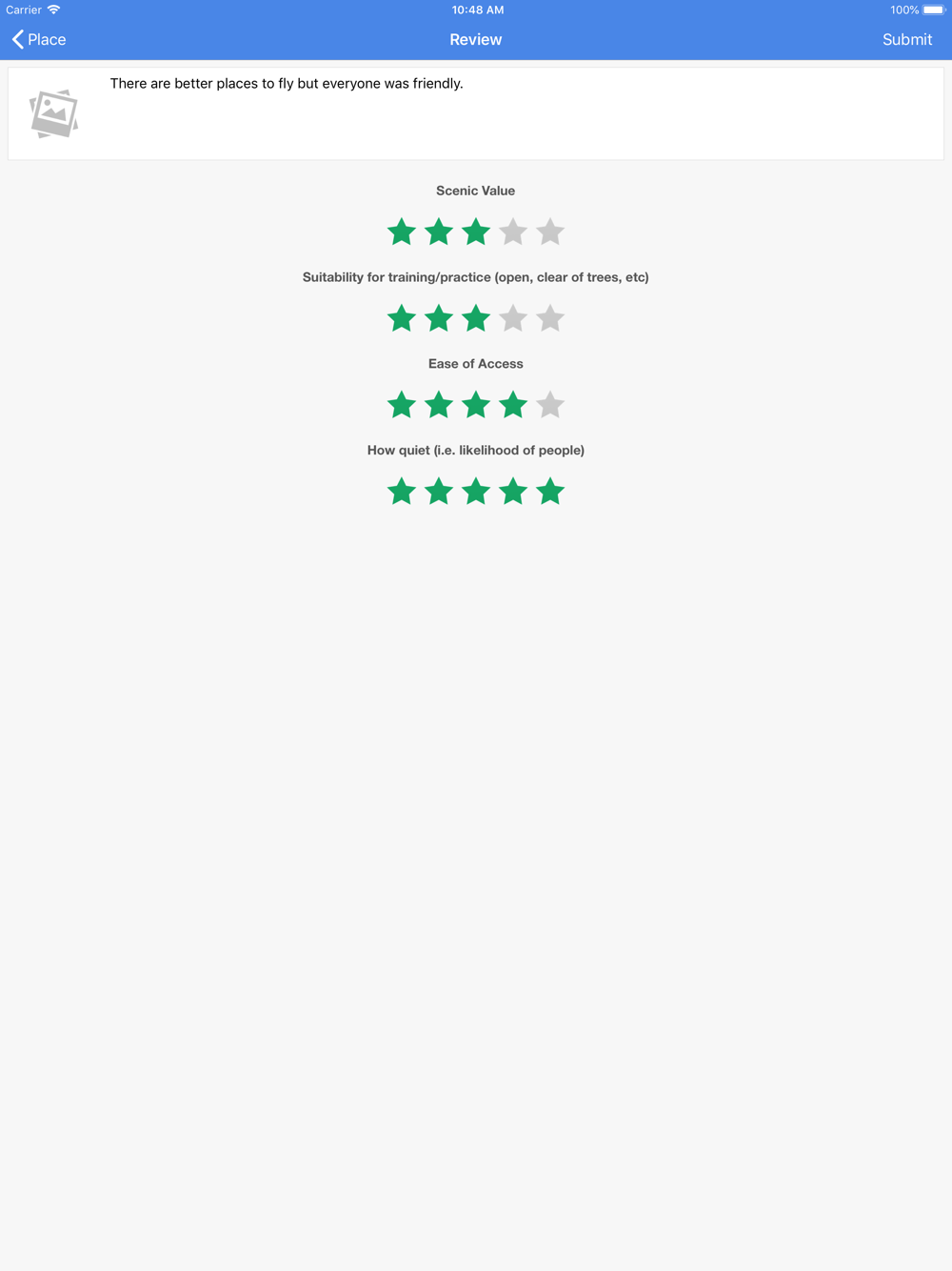This app provides a way for people to share appropriate and legal sites they have found for flying, wherever they are in the world. Be it a large, unobstructed open area; easily accessible public right of way for taking off from; beautiful scenery in open airspace for taking stills and video of; or all of the above!