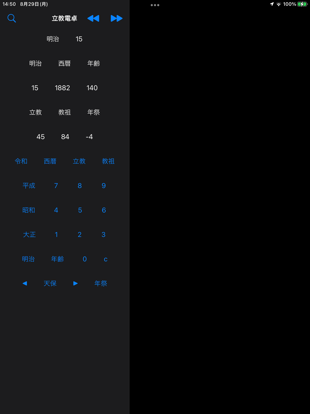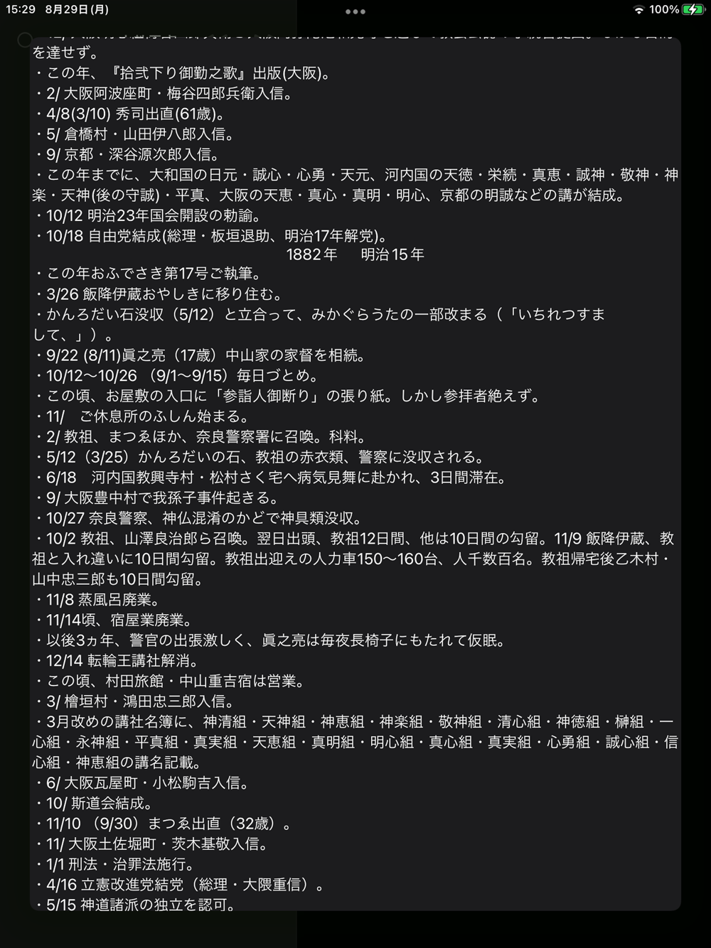 明治15年の年表上の出来事が表示されていませんでした。「年祭」の表示を次の年祭まで何年かの表示から、この年が何年祭に当たるかに変更しました。一度アプリをアンインストールしてからインストールし直してください。