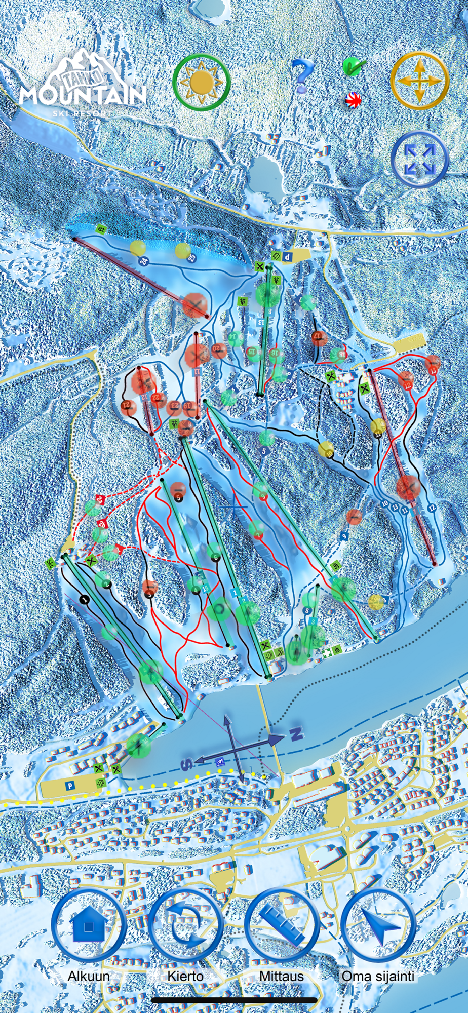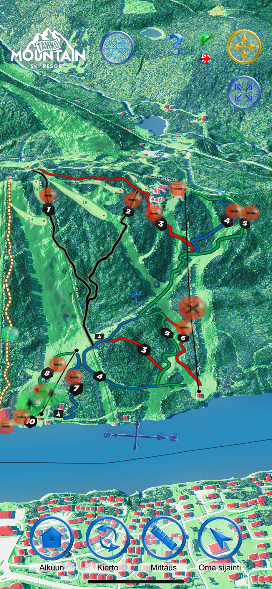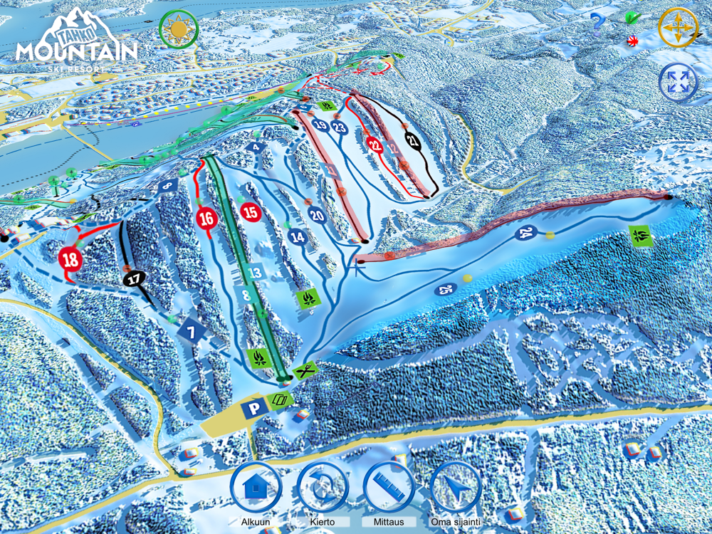 Tahkon 3D-rinnekartassa näet yhdellä silmäyksellä avoimet hissit (valitse haluamasi lisätietoja varten). Voit katsella Tahkovuorta eri suunnista ja mitata etäisyyksiä. Voit myös tarkistaa oman sijaintisi rinnekartalla ja kompassisuuntia.