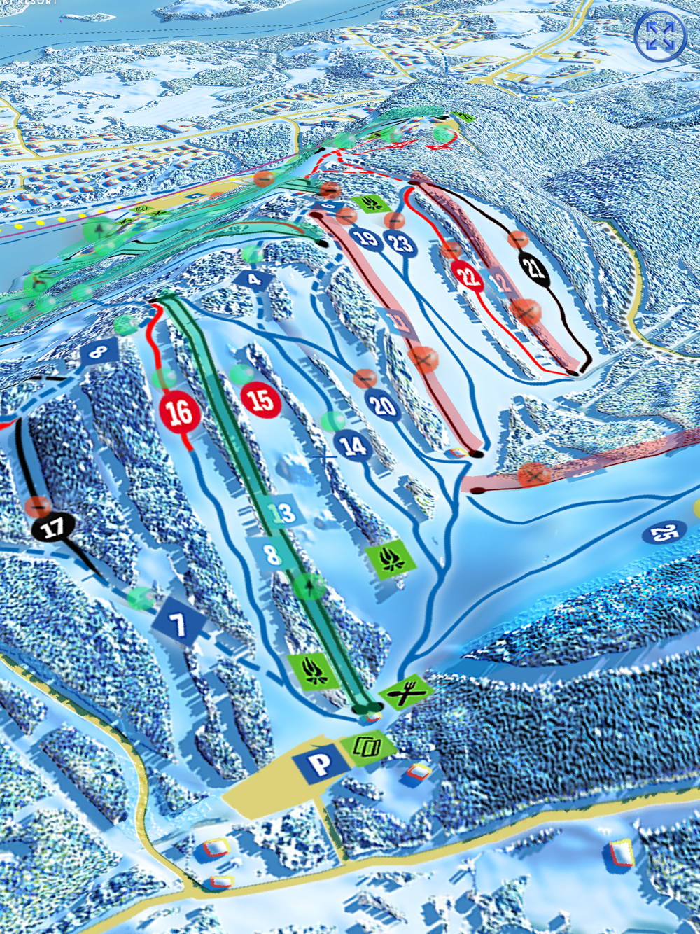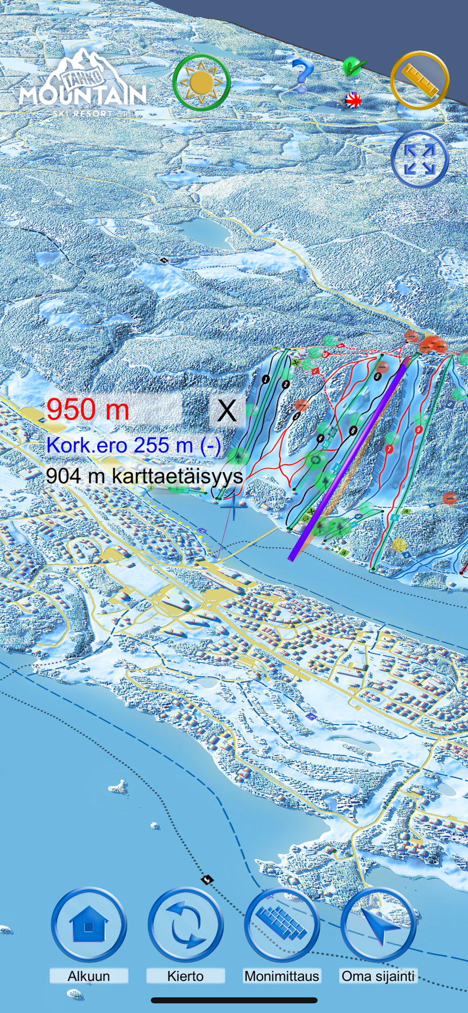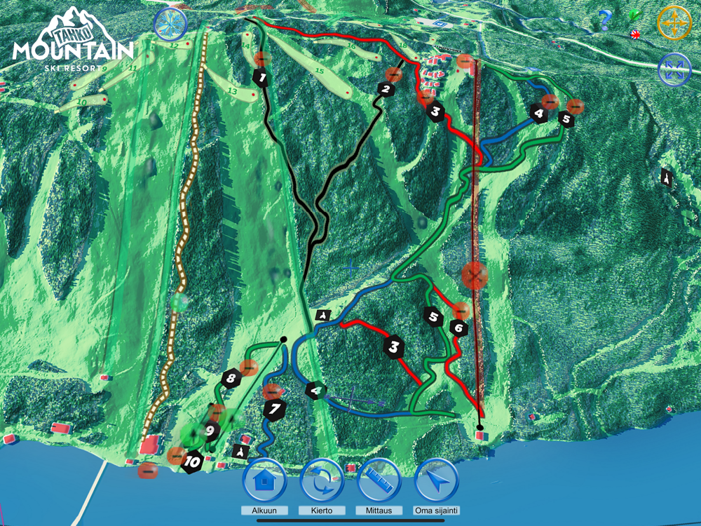 Tahkon 3D-rinnekartassa näet yhdellä silmäyksellä avoimet hissit (valitse haluamasi lisätietoja varten). Voit katsella Tahkovuorta eri suunnista ja mitata etäisyyksiä. Voit myös tarkistaa oman sijaintisi rinnekartalla ja kompassisuuntia.