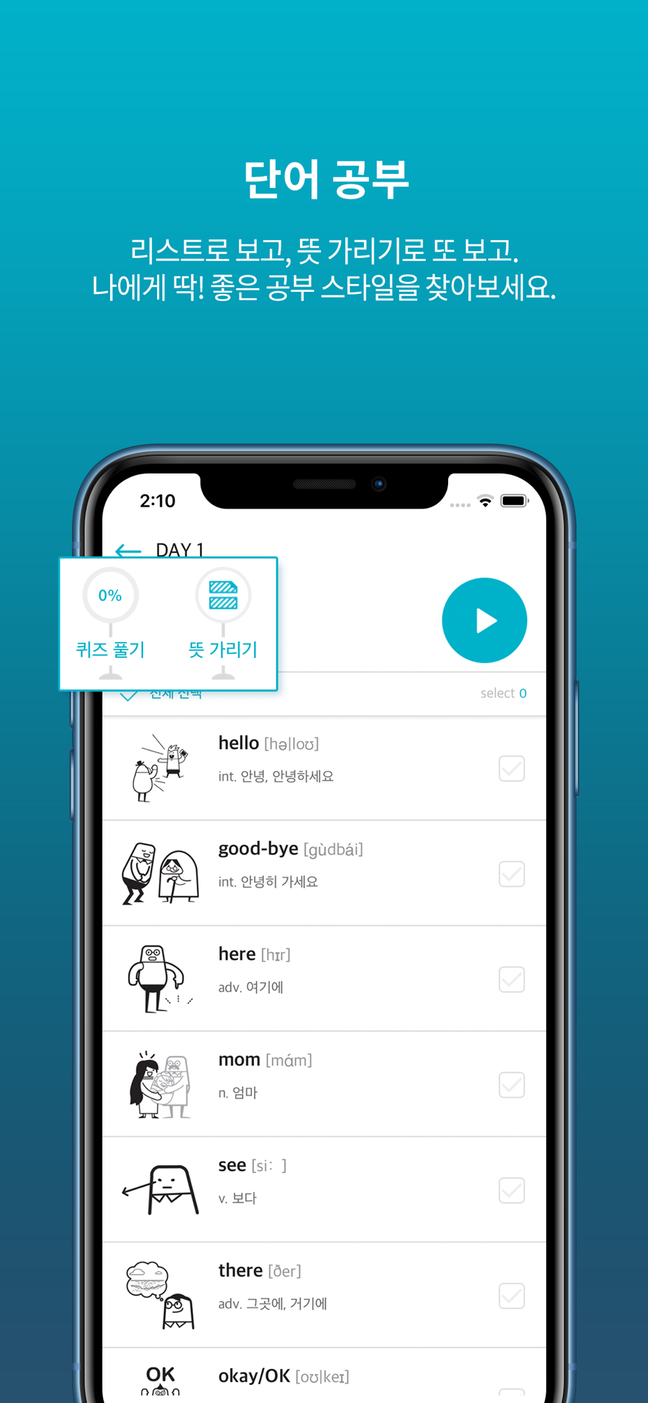 - 재미있게 퀴즈를 풀면서 단어를 암기하니까! 단어 암기가 지루하지 않아요.
